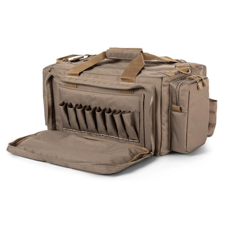 Der 5.11 Tactical Range Ready Bag ist aus haltbarem, wetterfestem 600D Polyester hergestellt. Er verfügt über separate, gepolsterte Fächer für mehrere Pistolen, einen Organizer mit Reißverschluss auf der Vorderseite, in dem 8 Magazine aufbewahrt werden können, sowie Seitentaschen und eine herausnehmbare Munitionstasche. Das erleichtert die Reinigung und stellt die Munitionsversorgung sicher. Mit einem gepolsterten Schultergurt, griffigen Tragegriffen und einem Einsatz für ein Namensschild bist Du im Handumdrehen auf dem Schießstand zu Hause.