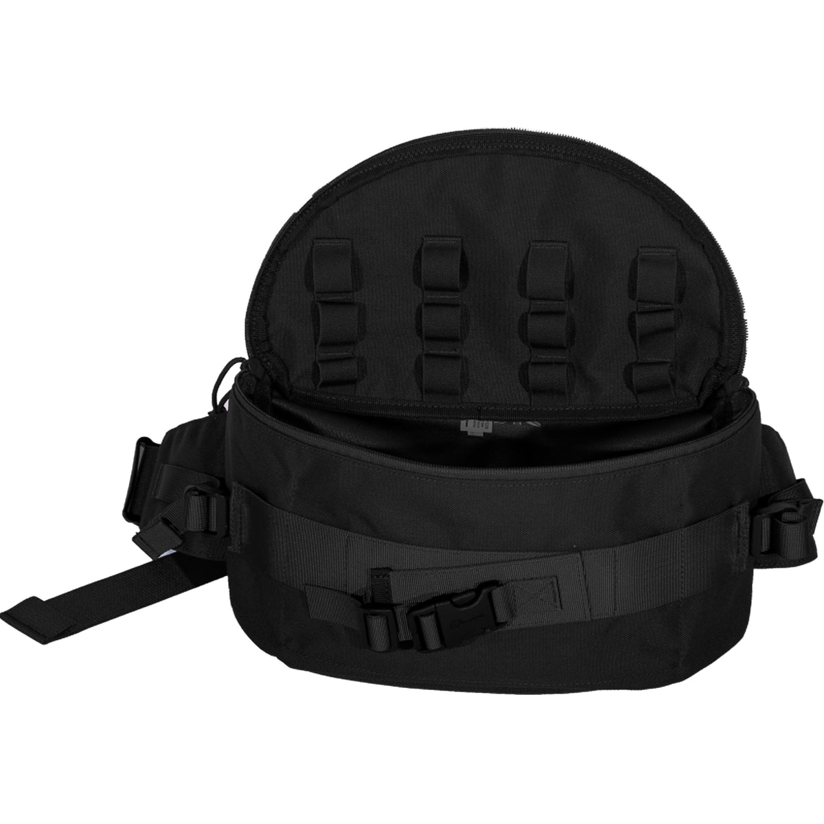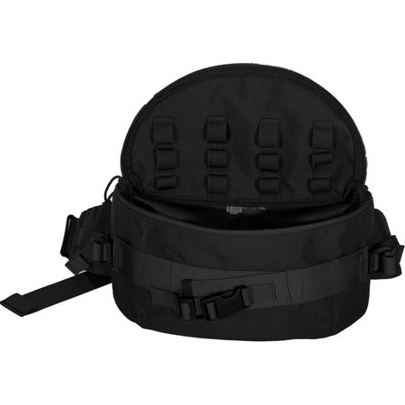 Der Hüftgurt mit dem Einhand-Schnellverschluss kann auf der Rückseite hinter dem MOLLE-Panel versteckt werden. Dank der ergonomischen Form kann die Tasche auch unter dem Plattenträger mit Hüftgurt getragen werden.
