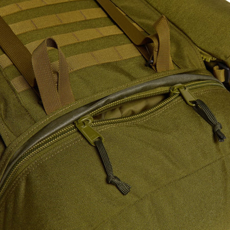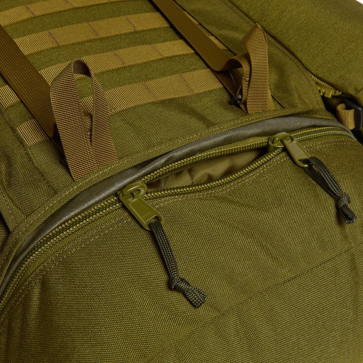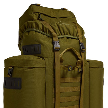 Das Volumen teilt sich auf in das große 80-Liter Hauptfach, Bodenfach und zwei 10-Liter MMPS-Seitentaschen. Das Haupt- und Bodenfach sind durch eine Schneeschürze getrennt, welche mit einem Kordelzug geöffnet oder geschlossen werden kann. Die zwei abnehmbaren MMPS-Seitentaschen mit je 10 Liter Volumen lassen sich mit einem Reißverschluss zu einem Tagesrucksack zusammenfügen (Schultergurte, Brustgurt und Armlehnengurte sind im oberen Fach enthalten). Durch mehrere Kompressionsriemen und MOLLE-Schlaufen lassen zusätzliche Ausrüstungsteile sicher befestigen.