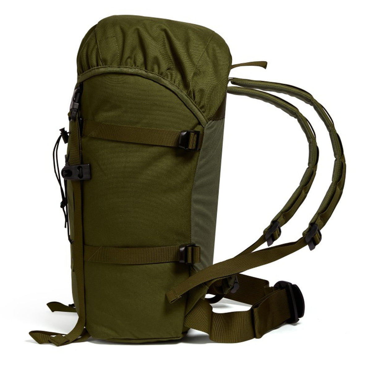 Neben dem Hauptfach steht noch ein Deckelfach für die zusätzliche Aufnahme von Ausrüstung zur Verfügung. Seitlich sind jeweils 2 Kompressionsriemen vernäht um auch bei geringem Rucksackinhalt alles fest zusammenziehen zu können. Ein Kordelzug mit Gummiband dient dem schnellen drunterklemmen von Jacken oder anderer leichter Kleidung.