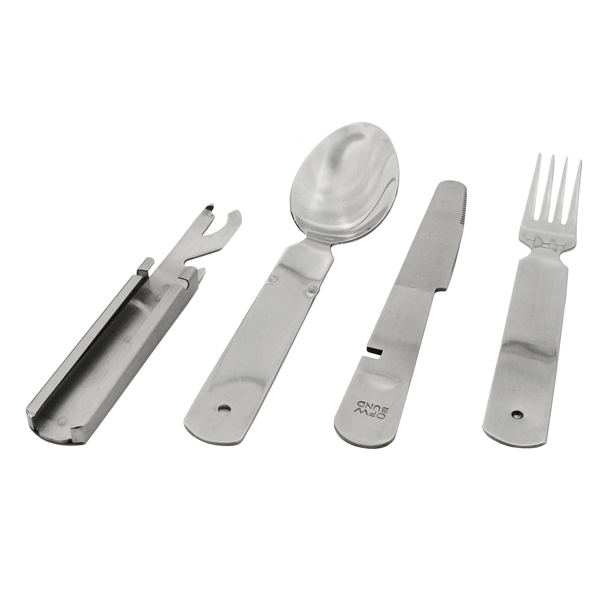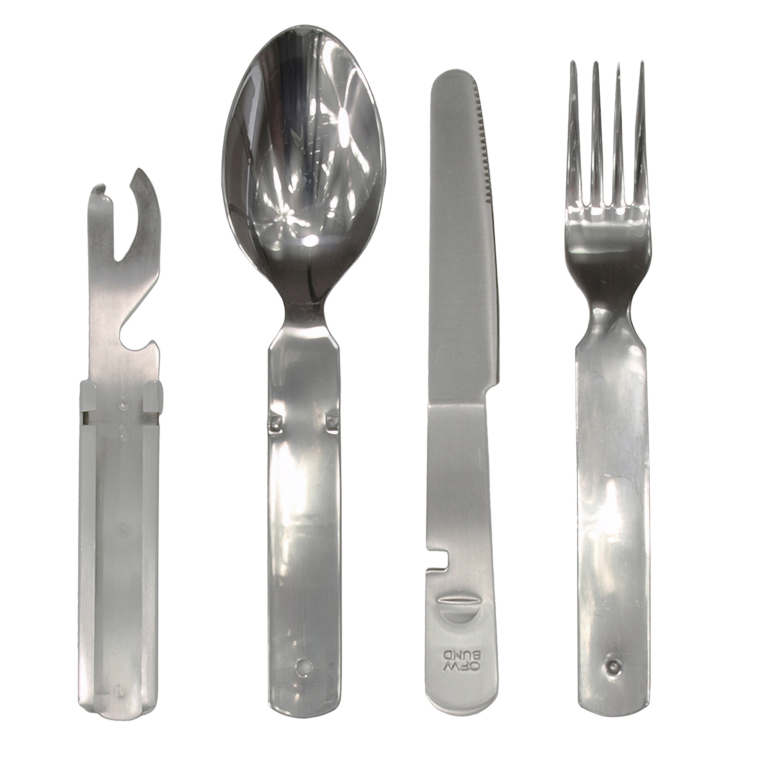 - 4-teilig (Messer, Gabel, Löffel, Dosen-/ Flaschenöffner)