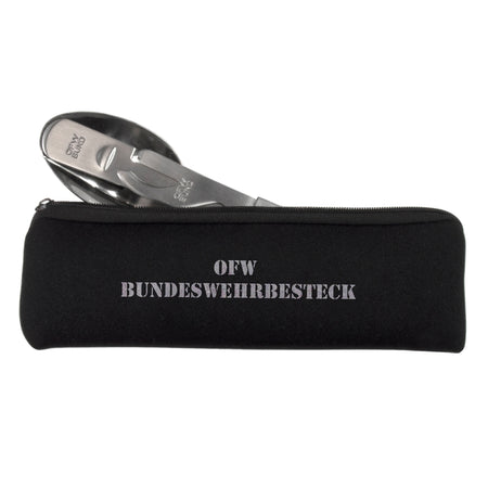 Das wirkliche Original Bundeswehr Eßbesteck, hergestellt in den Formen von Otto Förster Wupperthal (OFW). OFW war lange Zeit Erstausrüster der Bundeswehr. In der Qualität nach wie vor unübertroffen und sehr sauber verarbeitet. Mit schnitthaltigem Messer, Dosen- und Flaschenöffner, Gabel und Löffel. Es ist sehr stabil, kompakt zu verstauen, rostfrei und kommt inklusive einem praktischen Neoprenetui.