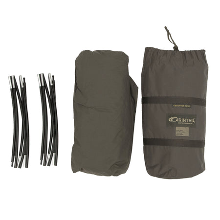 Das CARINTHIA Observer Plus Zelt perfekte Biwakzelt für Scharfschützen, mit selbststehender Doppel-Gestänge-Unterstützung. Die beiden kreisförmigen Zeltstangen formen eine Art Kuppel am Kopfende, die für den Anwender genügend Platz bietet, um die Ausrüstung unterzubringen. Der Observer Plus verfügt über eine leicht abfallende Linienführung vom Kopfbereich hin bis zum Fußende. Damit soll verhindert werden, leicht erkannt/entdeckt zu werden.