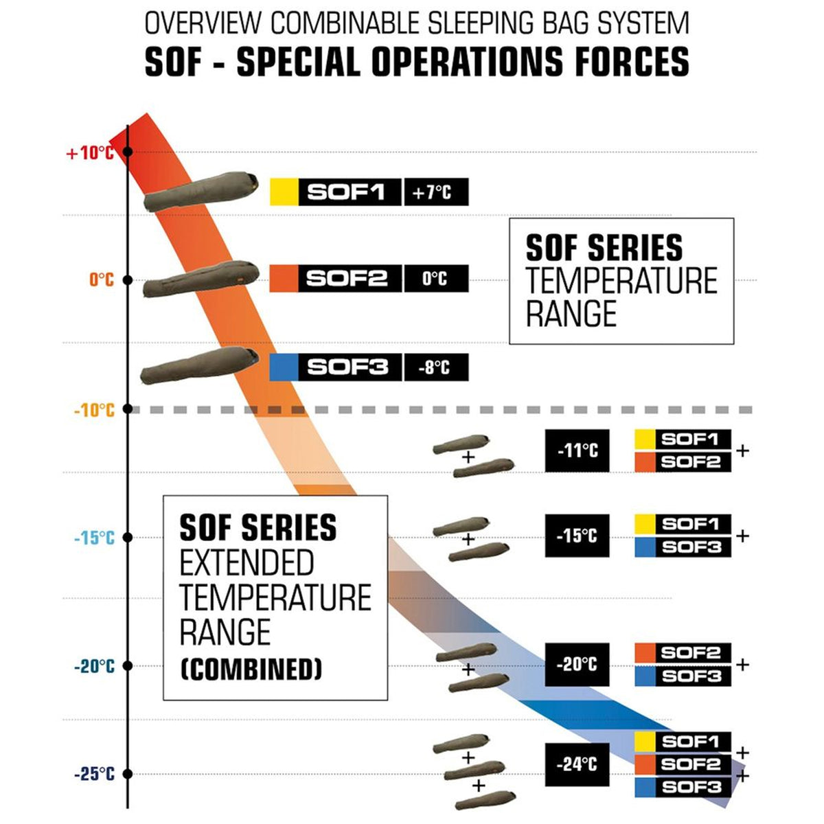 Der mittig angebrachte Reißverschluss des SOF 2 verhindert Kältebrücken beim Kombinieren mit den anderen Modellen der Serie, SOF 1 und SOF 3, um ein breites Temperaturspektrum abzudecken. Der SOF 2 punktet mit seiner effizienten Wärmeleistung. Außerdem bietet er große, freilaufende Reißverschlüsse, die einen schnellen Ausstieg ermöglichen. Auch hier kommt das innovative Farbcordierung mit Klettflächen zum Einsatz und erleichtert die schnelle Identifizierung und Auswahl des richtigen Schlafsacks bei Einsätzen.