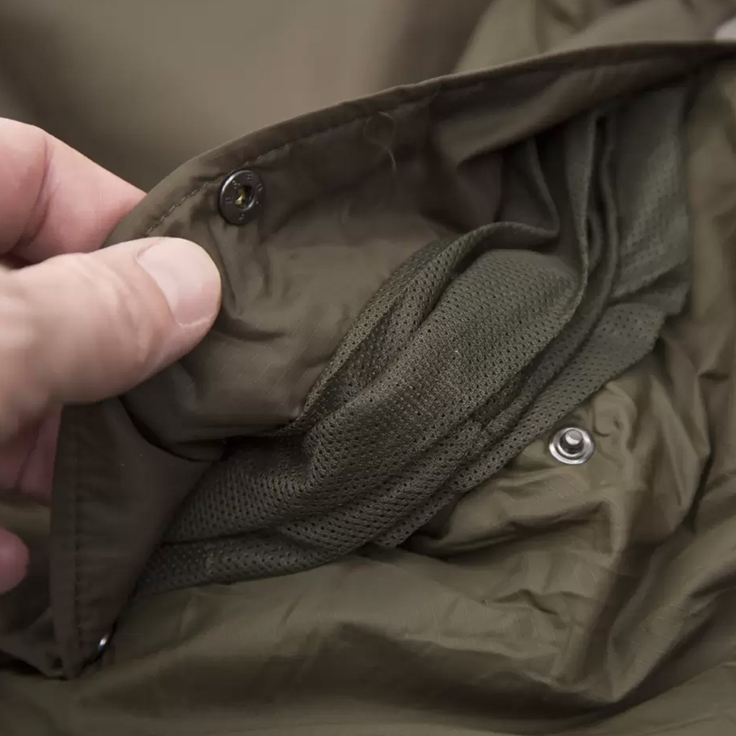 Bei schönem Wetter kann der untere Teil des Zwei-Wege-Reißverschlusses zur Belüftung geöffnet werden. Der Kopfbereich ist mit einem Moskitonetz ausgestattet, welches durch Schlaufen fixiert wird. Das Mosquitonetz wird dann im Gesichtsbereich mit einem Reißverschluss fixiert.