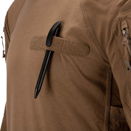 Die technische Schnittführung der Ärmel aus sehr widerstandsfähigen, stretchigem und wasserabweisenden Material sorgt für eine extrem hohe Bewegungsfreiheit. Die beiden Oberarmtaschen sorgen für ausreichend Stauraum, wärhend die Flauschflächen Platz für ID-Abzeichen und je zwei Einschubfächer für Schreibzeug bieten.