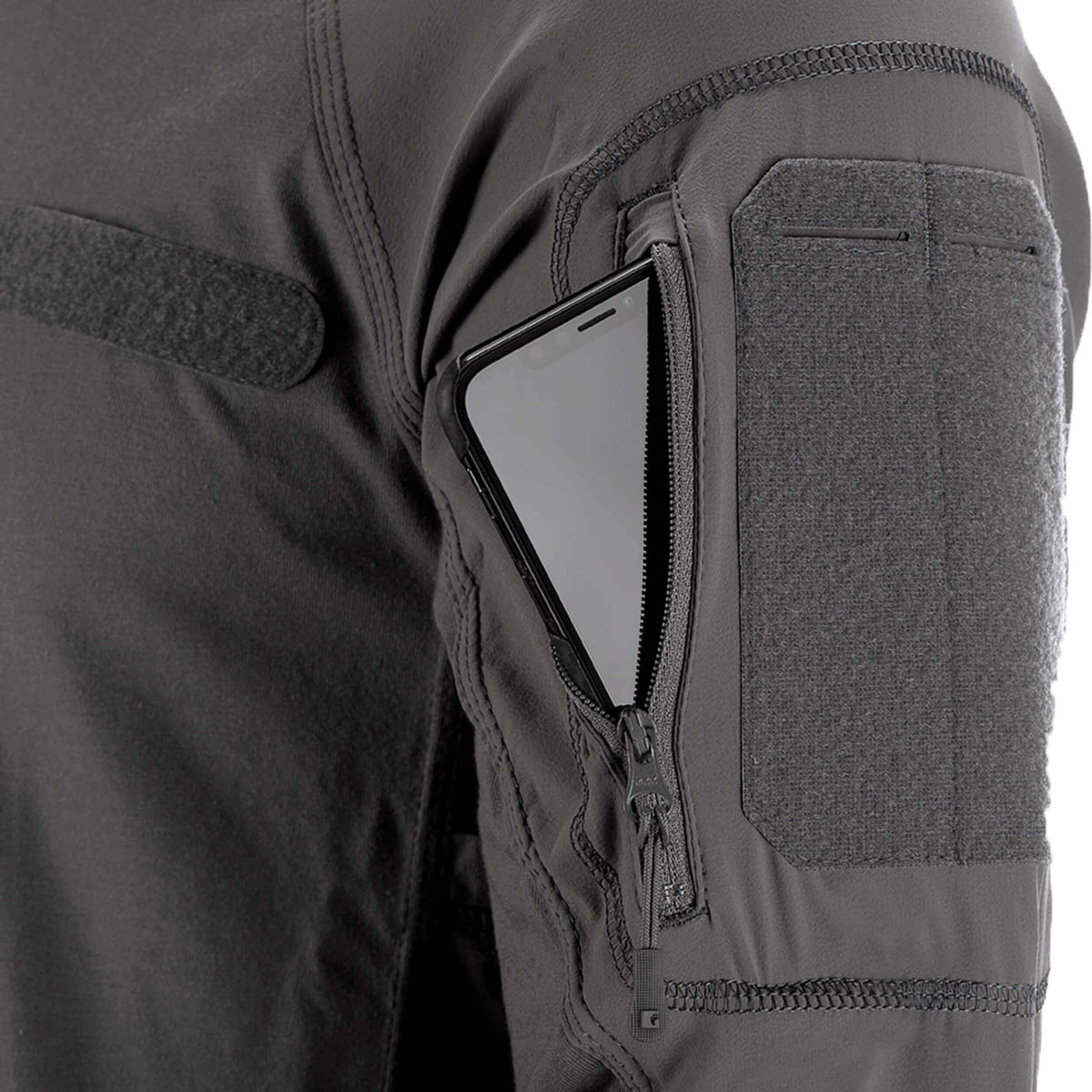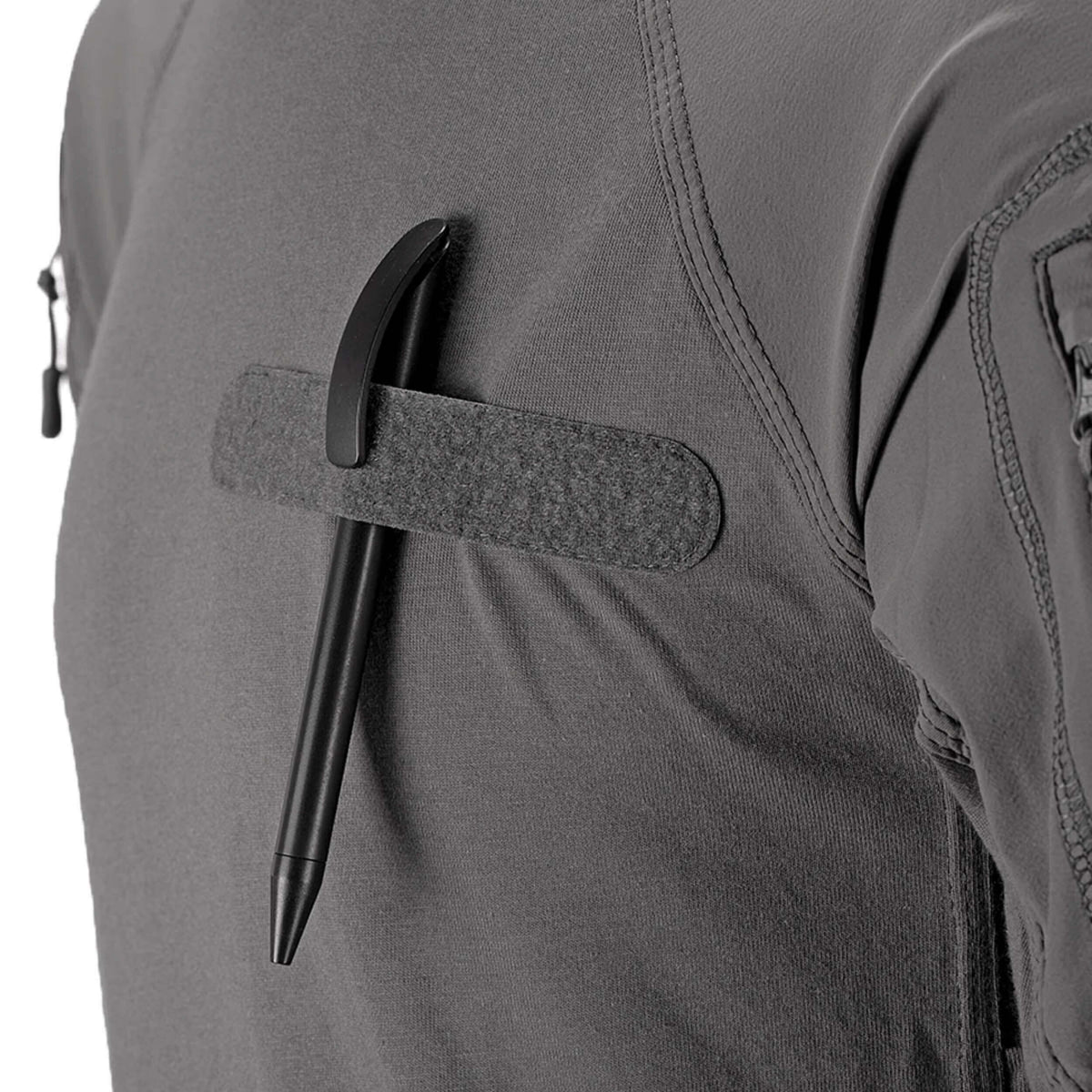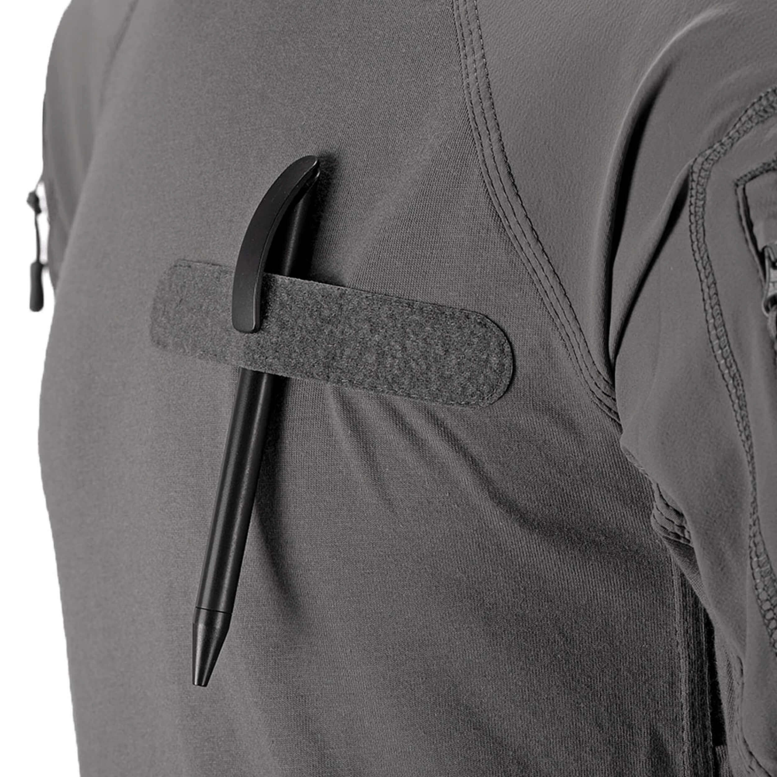 Die technische Schnittführung der Ärmel aus sehr widerstandsfähigen, stretchigem und wasserabweisenden Material sorgt für eine extrem hohe Bewegungsfreiheit. Die beiden Oberarmtaschen sorgen für ausreichend Stauraum, wärhend die Flauschflächen Platz für ID-Abzeichen und je zwei Einschubfächer für Schreibzeug bieten.