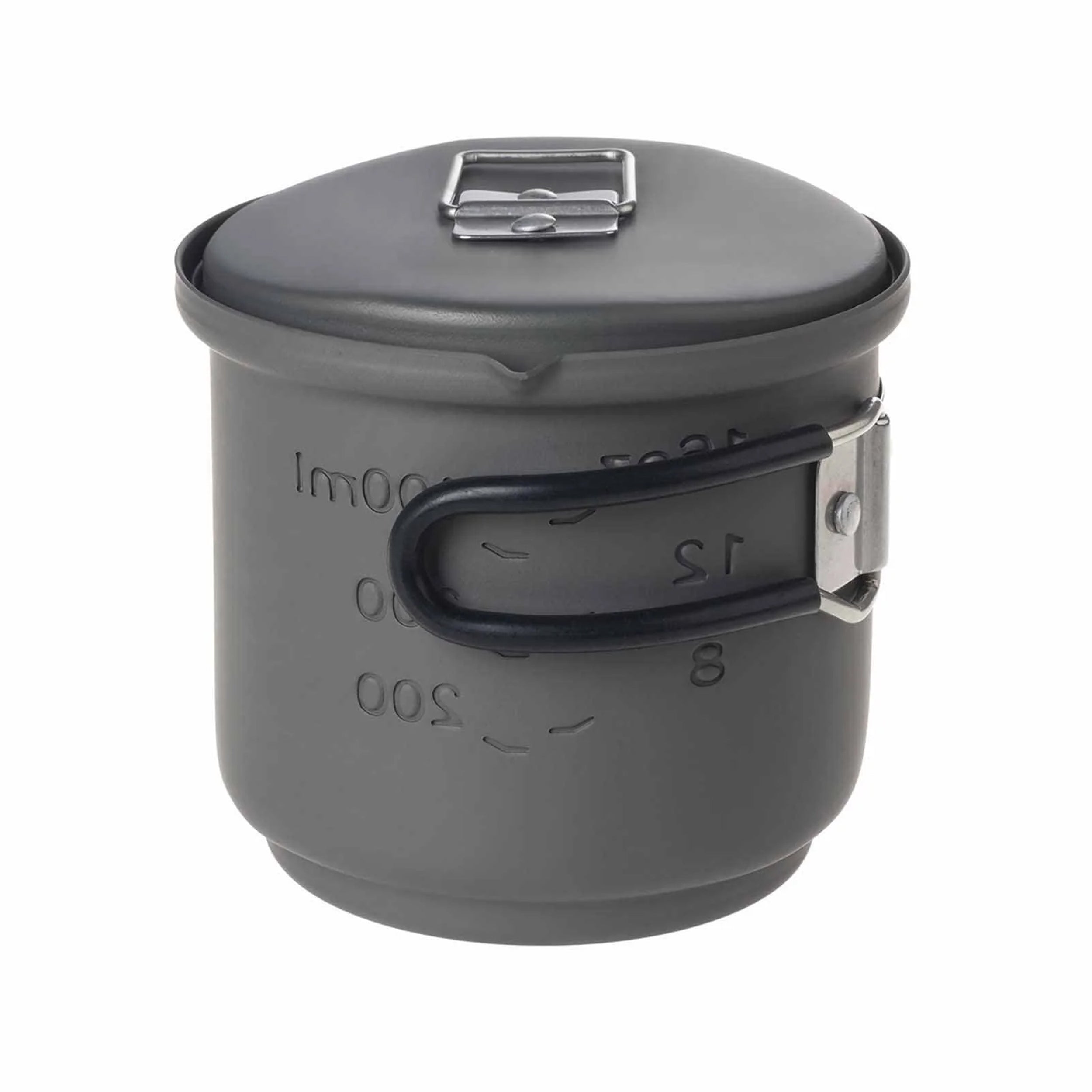 Das Topfmaterial und besteht aus leichtem, hartanodisiertem Aluminium. Der Stand des Kochsets besteht ebenfalls aus hartanodisiertem Aluminium, ist passgenau auf den Topf ausgelegt und sorgt damit für eine stabile Kochfläche. Der Stand findet für den Transport im Inneren des Topfes Platz.