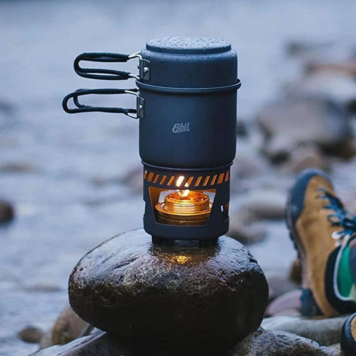 Beide Töpfe verfügen über klappbare Edelstahl-Griffe, die zum Hitzeschutz mit einem Silikonmantel versehen sind. Zudem zeigt eine Skala im Inneren des größeren Camping Topfes das Volumen in ml und oz an. Der Stand vom Spiritus Kocher besteht aus hartanodisiertem Aluminium und findet für den Transport zusammen mit dem Spiritusbrenner im Topfset Platz.