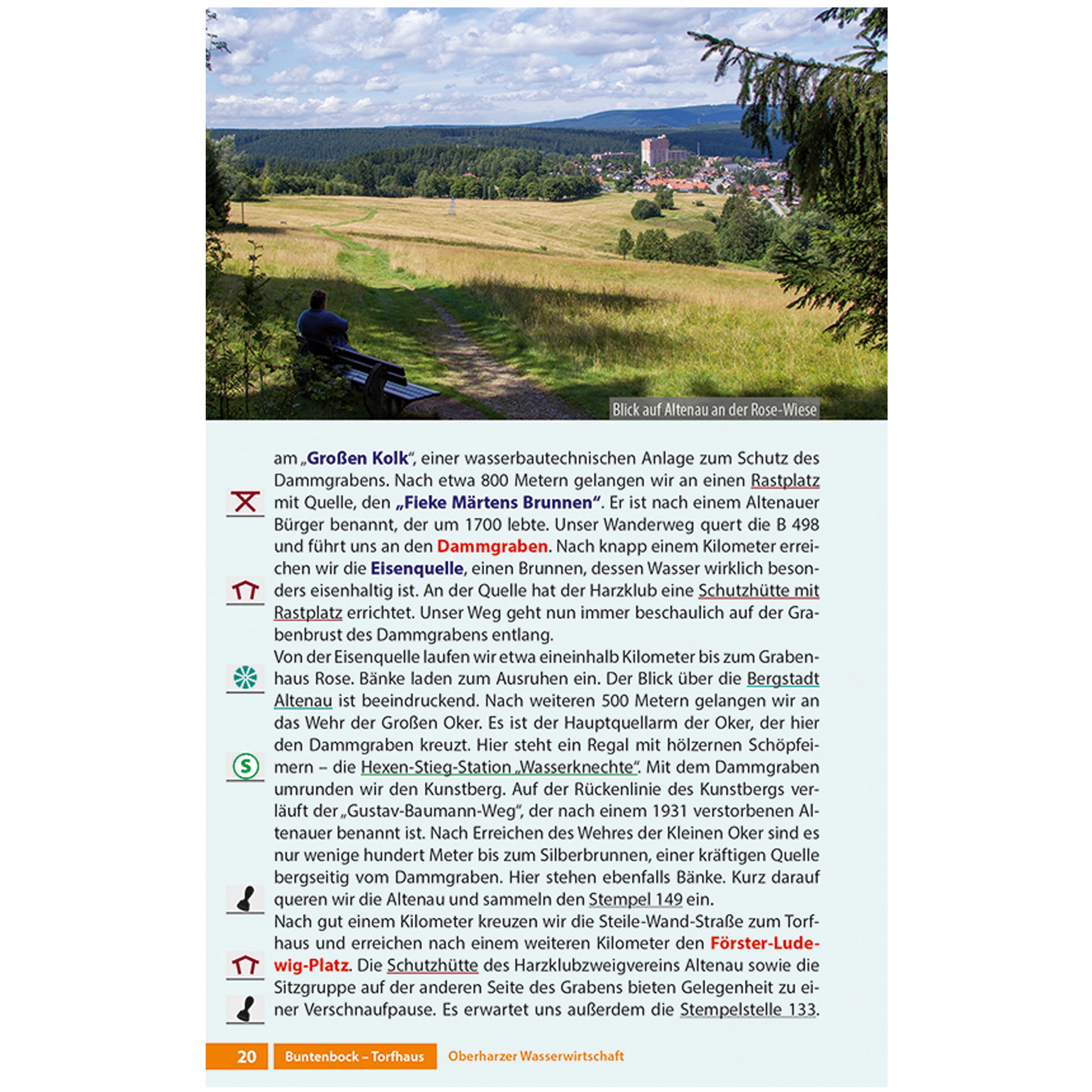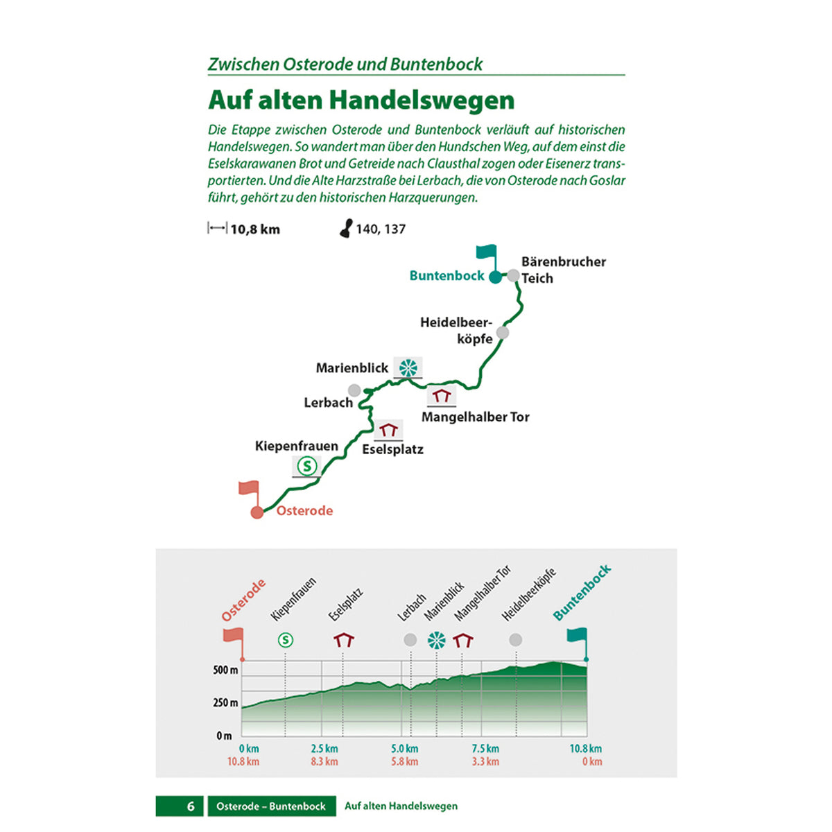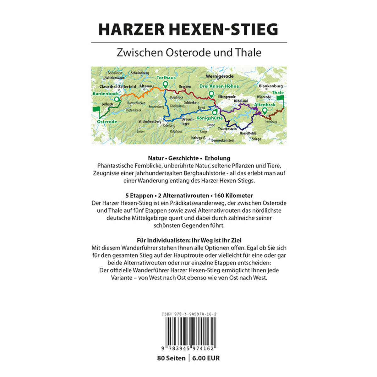 Mit dem offiziellen Wanderführer stehen Ihnen alle Optionen offen. Egal, ob Sie sich für den gesamten Stieg auf der Hauptroute entscheiden, auf eine der beiden Alternativrouten ausweichen oder nur eine einzelne Etappe wandern möchten – stets werden beide Laufrichtungen ausführlich beschrieben. Dabei gibt es viele Hinweise und Hintergrundinformationen zu Sehenswertem entlang der Strecke und zur Historie, sodass die Wandertouren zu erkenntnisreichen Erlebnissen werden. Bei der Planung von erholsamen Pausen helfen die genannten Einkehr- und Übernachtungsmöglichkeiten. Eine Vielzahl von Fotos illustrieren die Texte eindrucksvoll und lenken den Blick auf Details, die während der Wanderungen entdeckt werden können. Zur Orientierung dient eine Übersichtskarte. Zu jeder Etappe findet sich außerdem eine Weg-Grafik, die Höhepunkte markiert und jeweils ein hochwertiges Höhenprofil mit Unterwegszielen. So lassen sich die einzelnen Etappen bequem und präzise im Voraus planen. Zusätzlich können die GPS-Tracks zum Wanderweg kostenlos heruntergeladen werden. Außerdem wird auf alle Stempelstellen der Harzer Wandernadel entlang des Weges aufmerksam gemacht.
