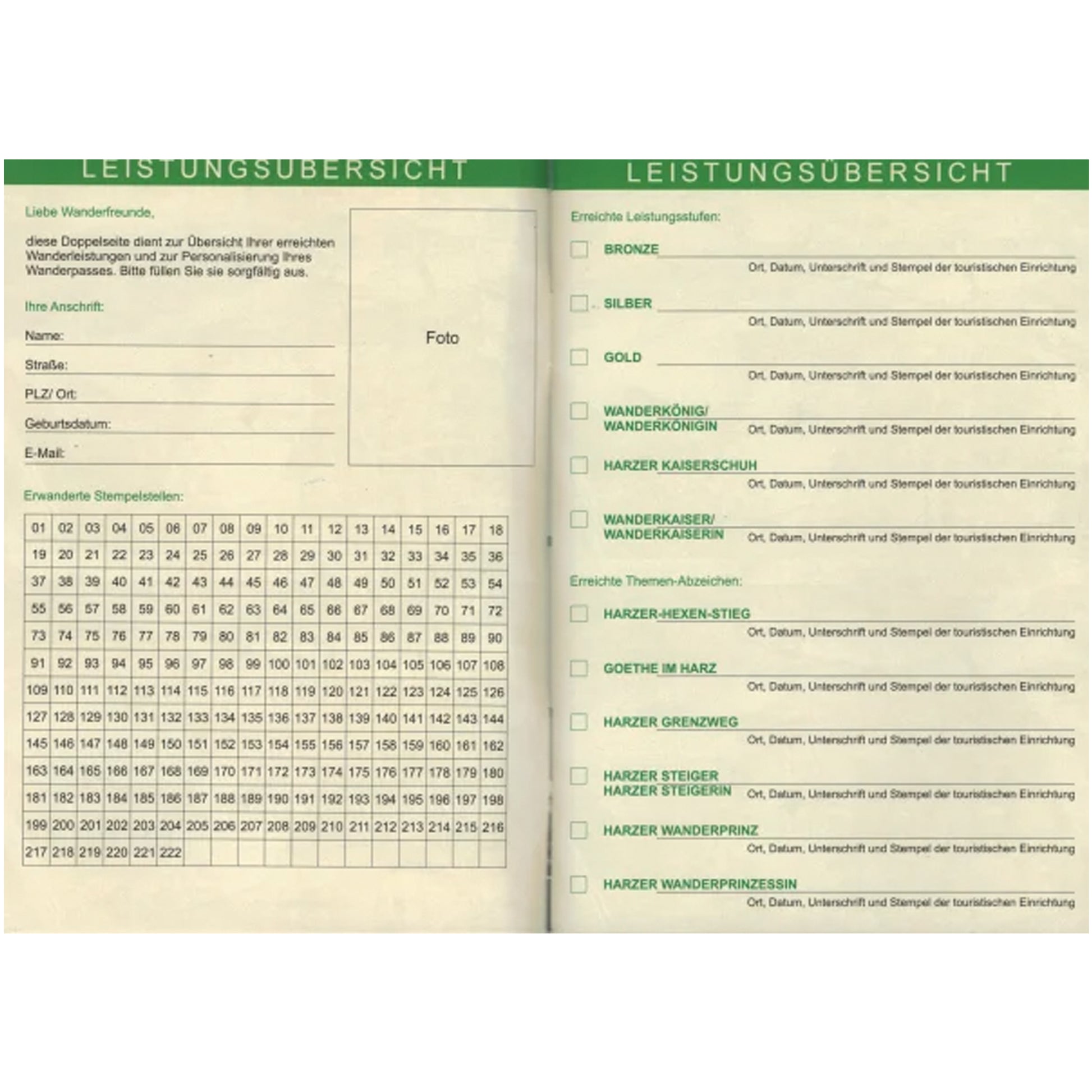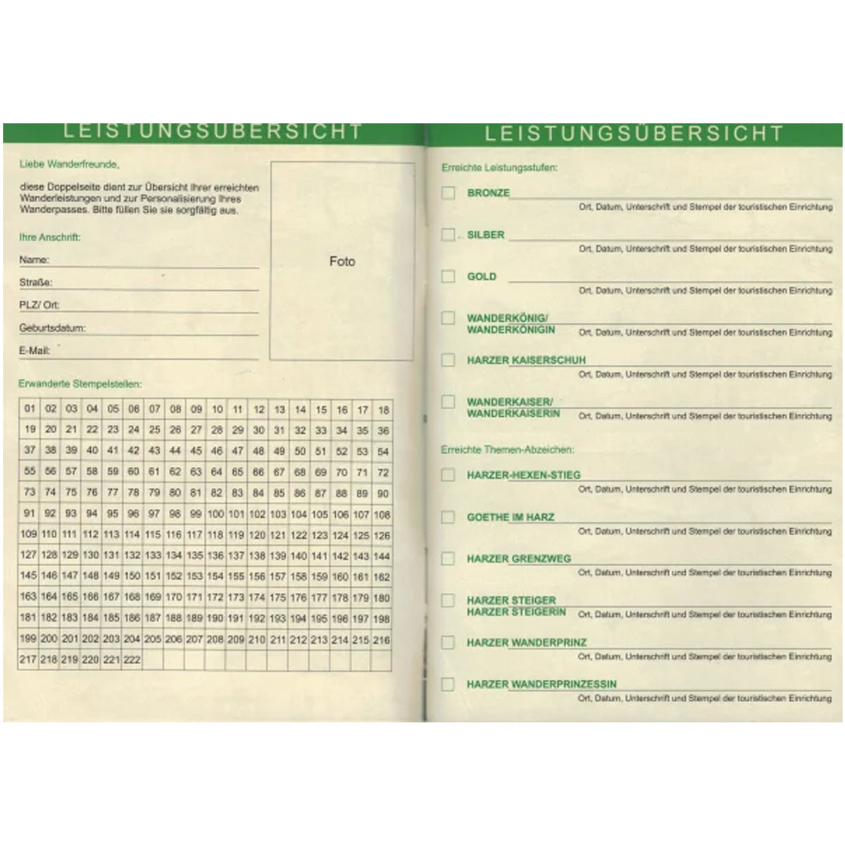 Der Wanderpass enthält neben den 222 Stempelfeldern zum Sammeln aller Stempel, die Spielregeln aller Abzeichen, eine Liste sämtlicher Stempelstellen und eine abtrennbare Postkarte für die Bestellung des „Harzer Wanderkaisers“. Es ist zu beachten, dass jeder Wanderer einen eigenen Wanderpass zum Erwerb der Wandernadeln benötigt. Diesen personalisieren Sie selbst, in dem dafür vorgesehenen Adressfeld.