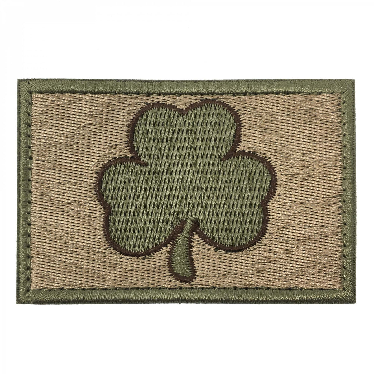Gewebter Patch aus Stoff mit gesticktem Kleeblatt.