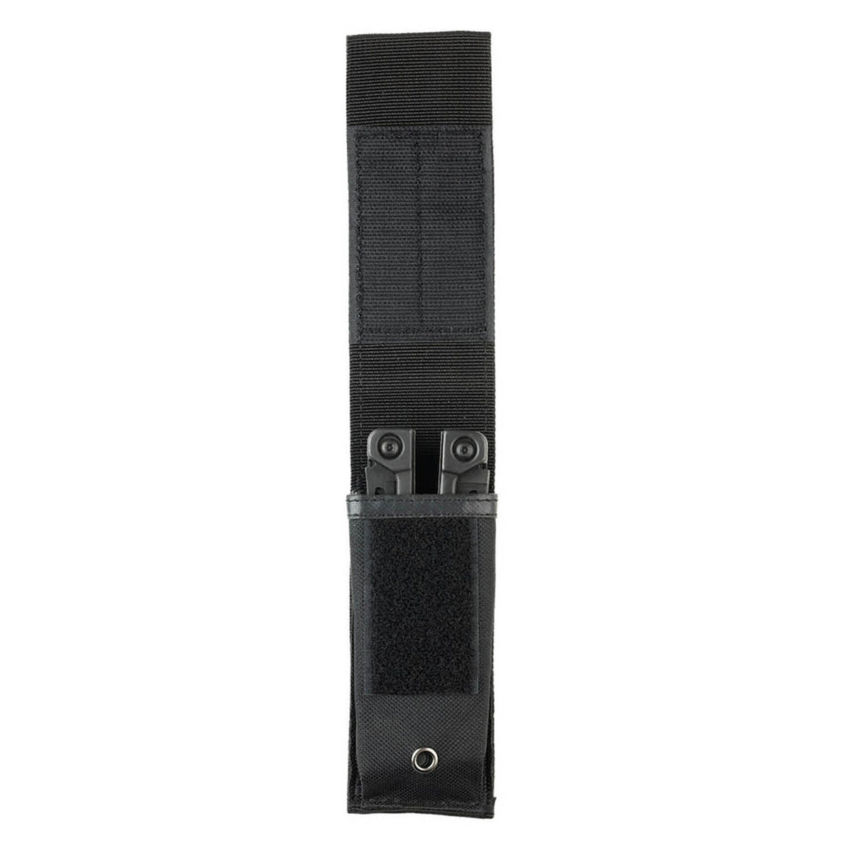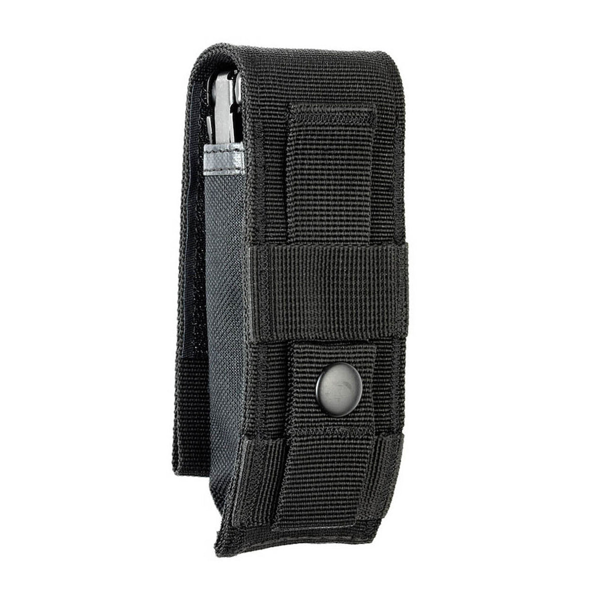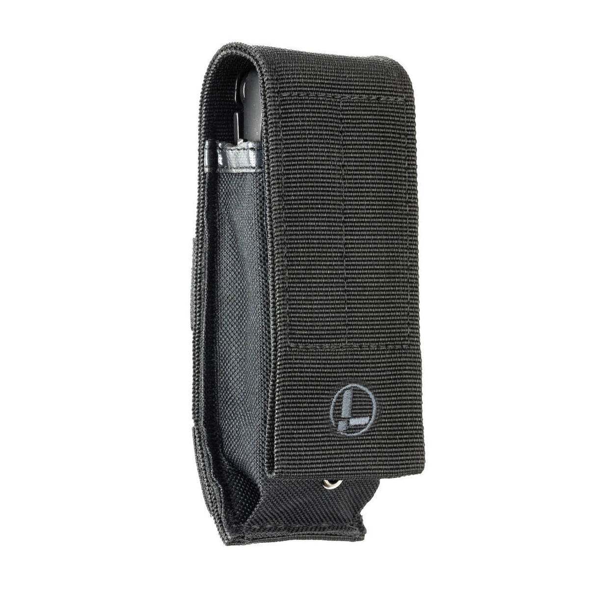 Das Leatherman MOLLE-Holster besteht aus strapazierfähigem ballistischem Nylon und verfügt über einen Klett- und Schnappverschluss zur Befestigung auf der Rückseite.