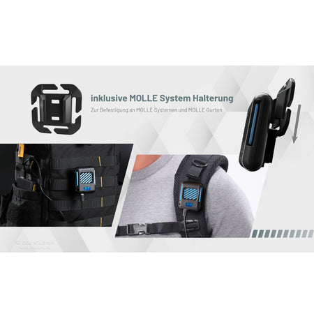 Lieferumfang: Nitecore EMR05, USB-C-Anschlusskabel (50cm), MOLLE-Halterung, Fangschnur.