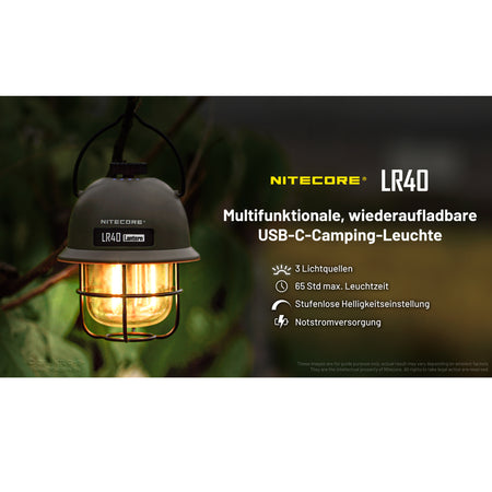 Der interne 4000mAh Li-Ion Akku wird über einen USB-C Port geladen, über einen USB-A-Port kann der Akku auch als Powerbank genutzt werden. Die Nitecore LR40 verfügt über ein weißen und ein warm weißes Licht, zusätzlich können die beiden Lichtfarben gemischt werden. Die Helligkeit ist stufenlos einstellbar. Ein Batteriestandsanzeige informiert über den aktuelle Ladeszustand der LR40.
