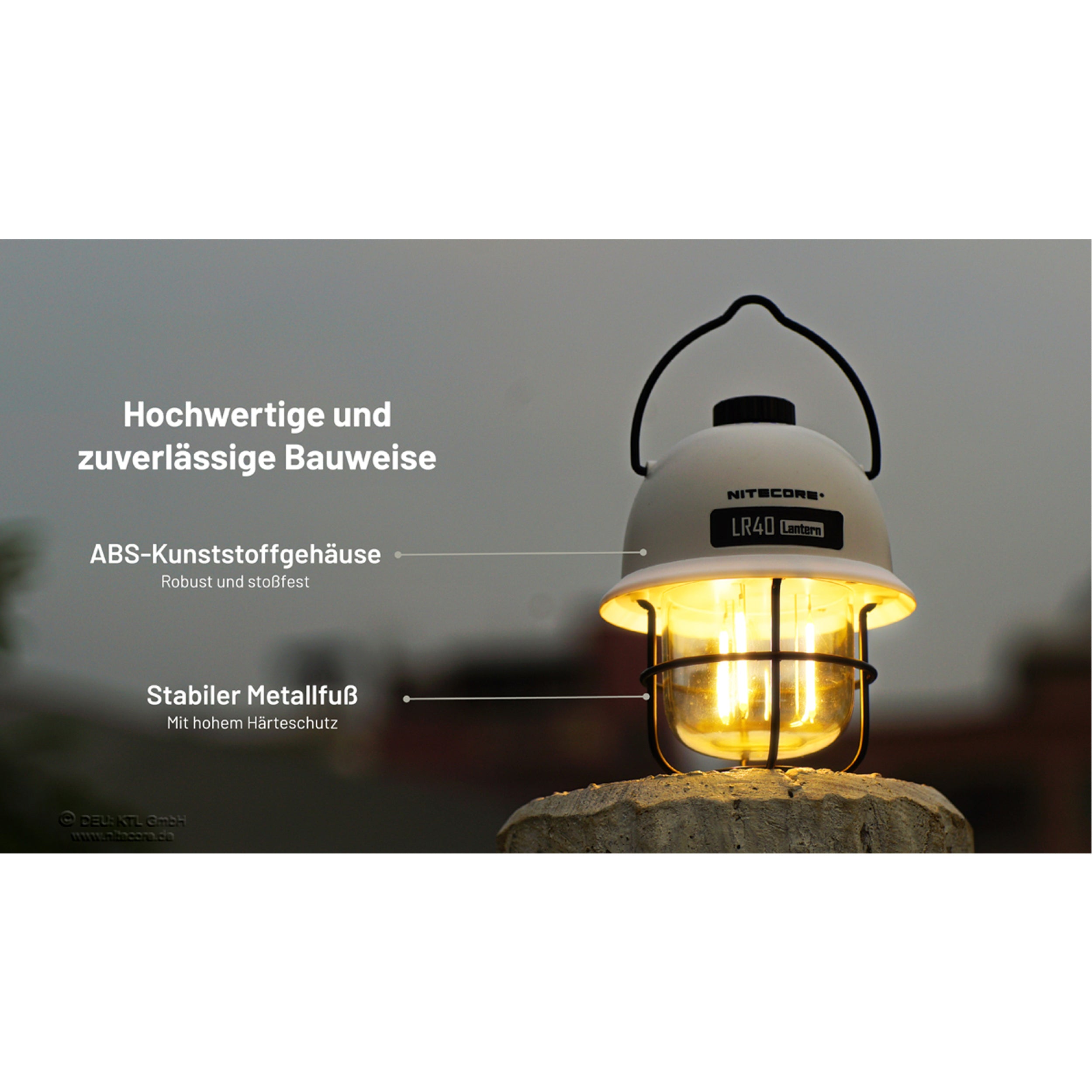 Die Nitecore LR40 ist eine Campinglaterne im Retro-Style, erhältlich in den Farben weiss und oliv. Sie kann aufgestellt oder aufgehängt werden.