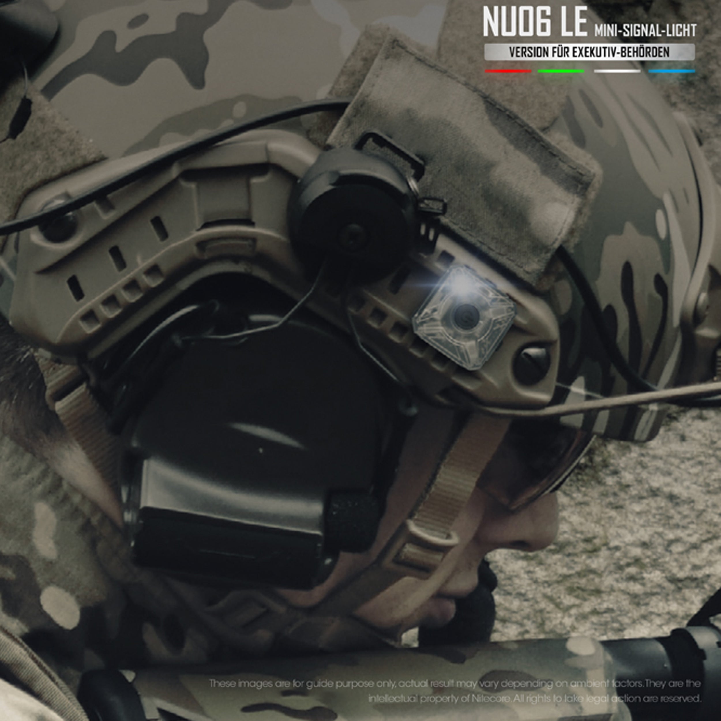 Die NU06 LE wird mit drei Halterungen geliefert: Eine magnetische (mit Klett), eine gebogene für den Helm (mit Klett) sowie eine Aufnahme zum Befestigen am MOLLE-System. Die NU06 LE ist mit einem Adapter für die ARC-Schiene ausgestattet und kann so ohne zusätzliche Halterung am Einsatzhelm befestigt werden.