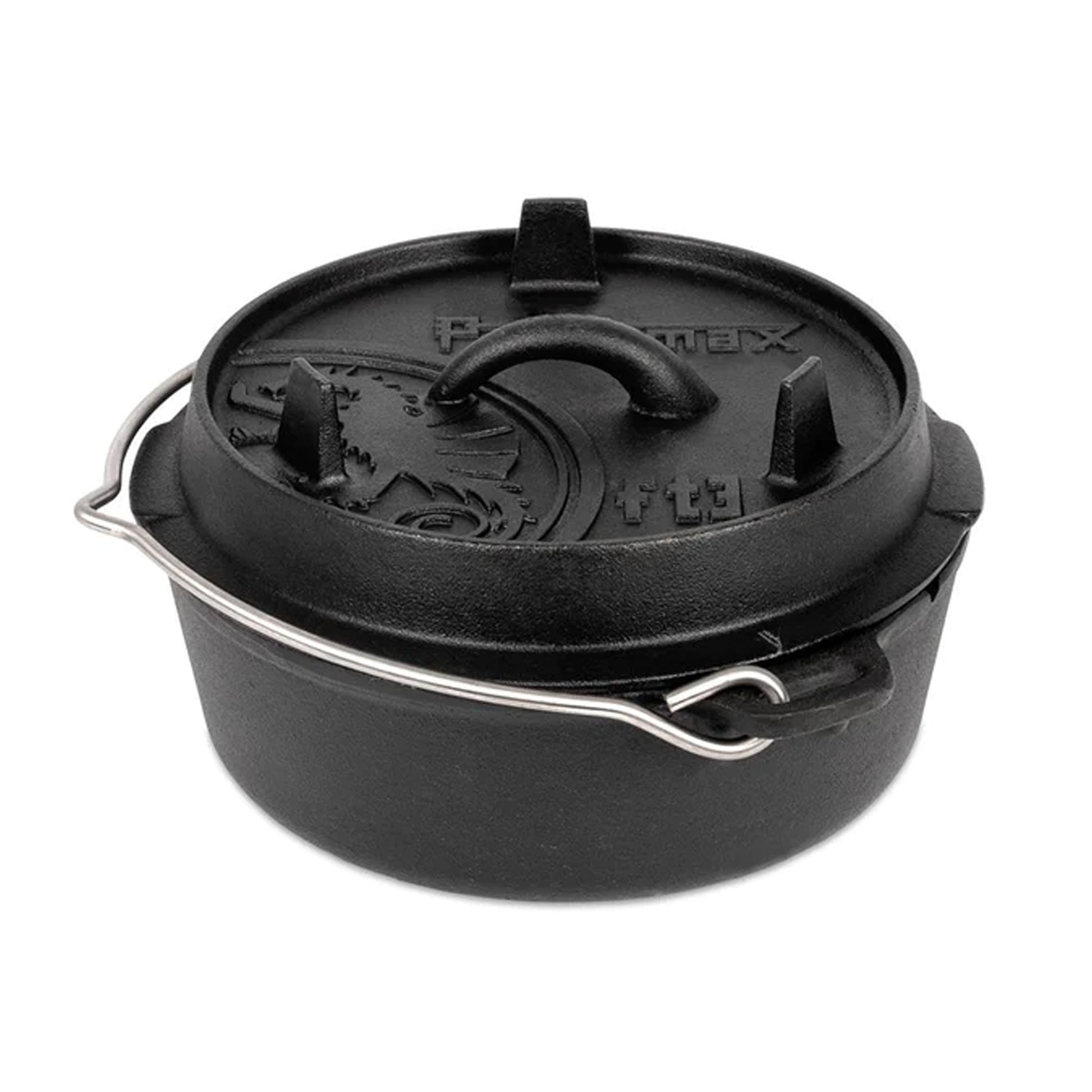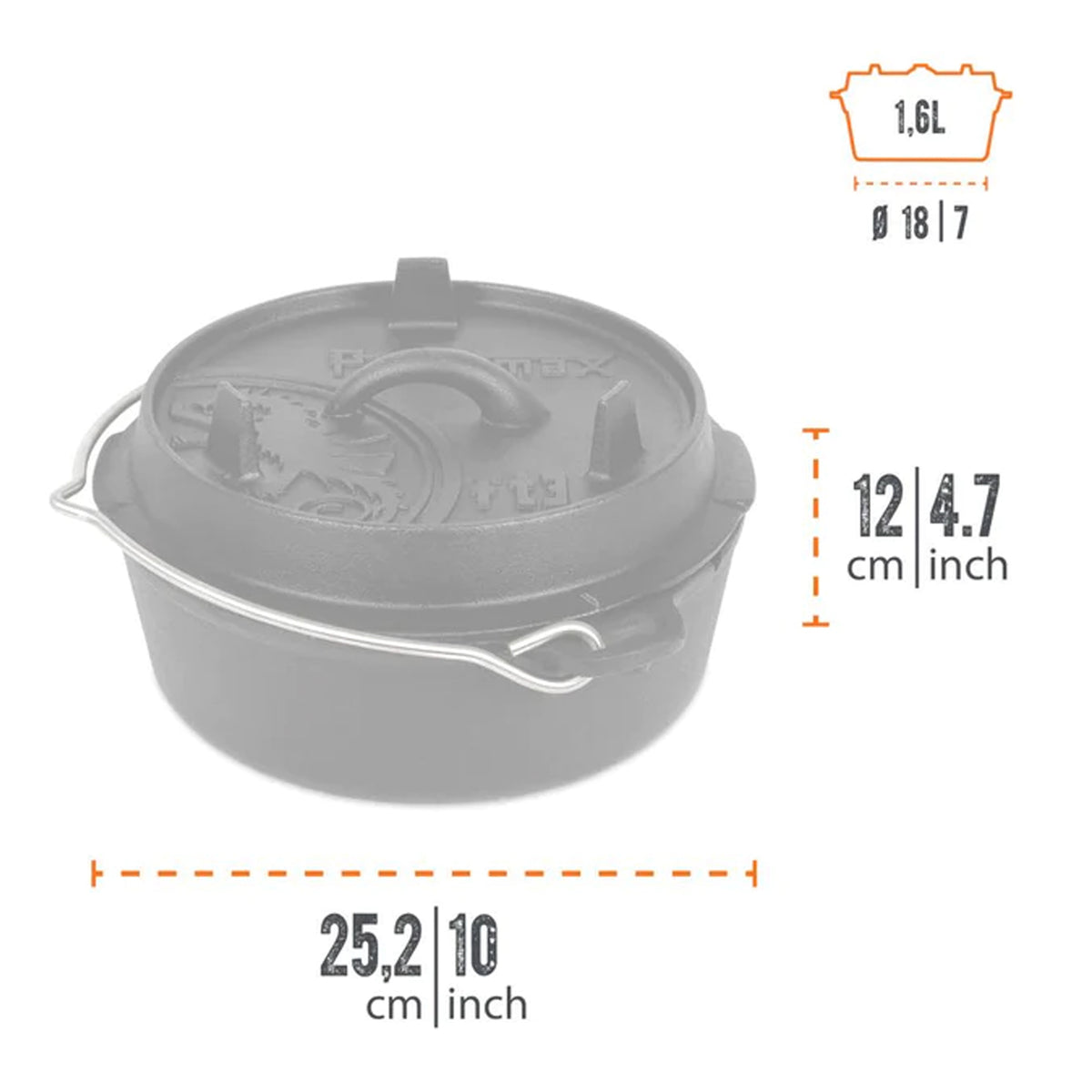 Durch die hervorragenden Eigenschaften des Gusseisens und die spezielle Oberflächenstruktur wird die Wärme effizient gespeichert und weitergeleitet. Die vorbehandelte Oberfläche (seasoned finish) macht ein erstmaliges Einbrennen unnötig und der robuste Feuertopf kann sofort verwendet werden. Im Freien wird er auf dem offenen Feuer oder mit Holzkohle verwendet. Der erhöhte Rand des Deckels ermöglicht es, Glut oder Holzkohle auch auf dem Feuertopf zu platzieren. So wird der Feuertopf von allen Seiten beheizt und eignet sich beispielsweise auch zum Brot backen.