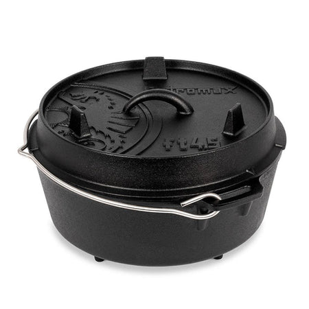 Durch die hervorragenden Eigenschaften des Gusseisens und die spezielle Oberflächenstruktur wird die Wärme effizient gespeichert und weitergeleitet. Die vorbehandelte Oberfläche (seasoned finish) macht ein erstmaliges Einbrennen unnötig und der robuste Feuertopf kann sofort verwendet werden. Im Freien wird er auf dem offenen Feuer oder mit Holzkohle verwendet. Der erhöhte Rand des Deckels ermöglicht es, Glut oder Holzkohle auch auf dem Feuertopf zu platzieren. So wird der Feuertopf von allen Seiten beheizt und eignet sich beispielsweise auch zum Brot backen.