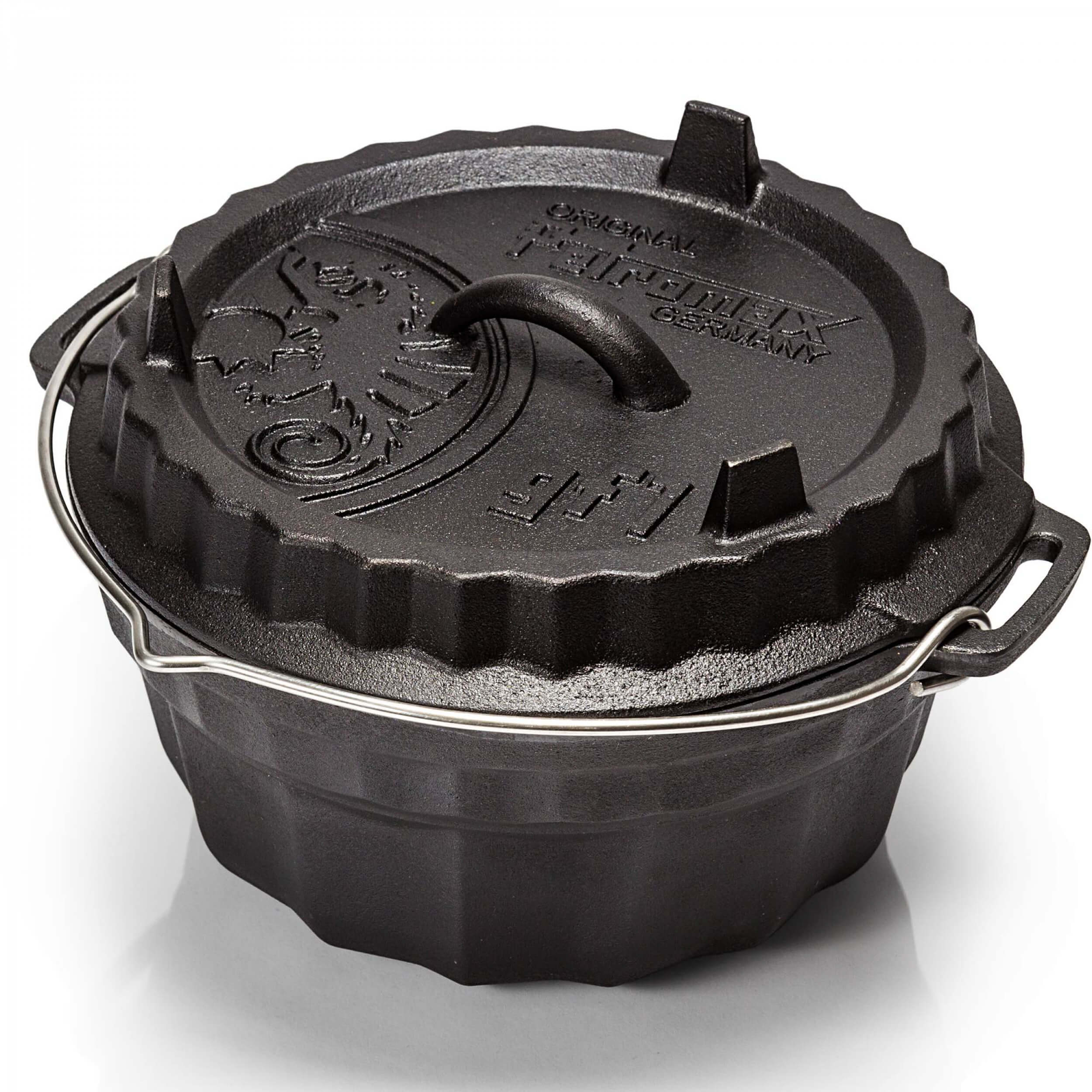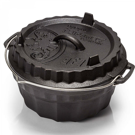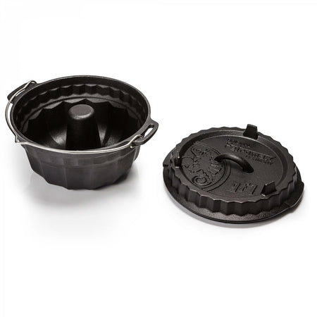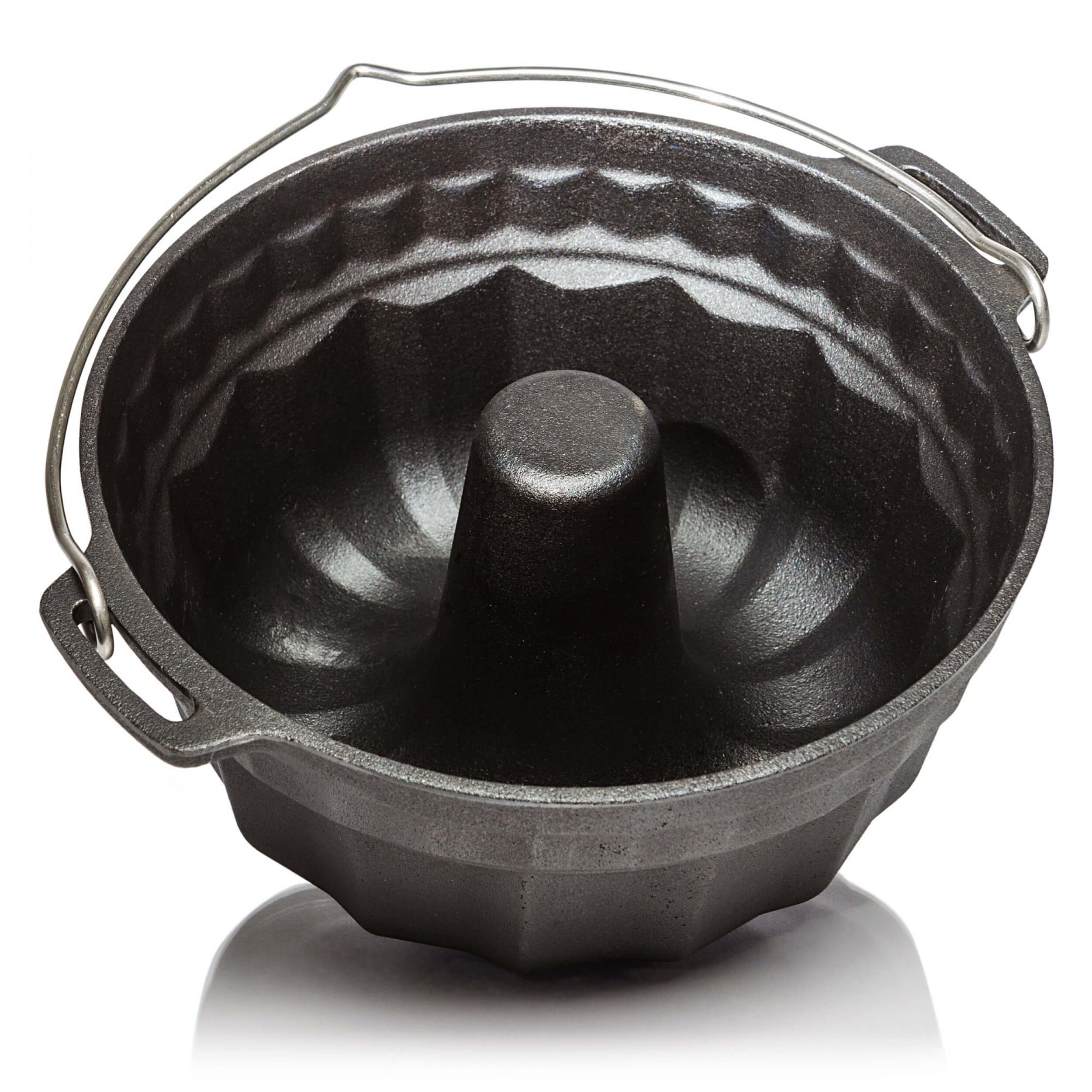 Durch die hervorragenden Eigenschaften des Gusseisens und die spezielle Oberflächenstruktur wird die Wärme effizient gespeichert und weitergeleitet. Die vorbehandelte Oberfläche (seasoned finish) macht ein erstmaliges Einbrennen unnötig und die robuste Gugelhupfform kann sofort verwendet werden. Im Freien wird die Form am Lagerfeuer mit Holz oder mit Holzkohle und Briketts beheizt. Hier kommt auch der praktische Tragehenkel aus Edelstahl mit Einkerbung zum Aufhängen zum Einsatz. Der erhöhte Rand des Deckels ermöglicht es, Glut oder Holzkohle sicher auf der Gugelhupfform zu platzieren. So wird sie von allen Seiten gleichmäßig erhitzt. Aber auch im heimischen Backofen macht die gusseiserne Form eine gute Figur.