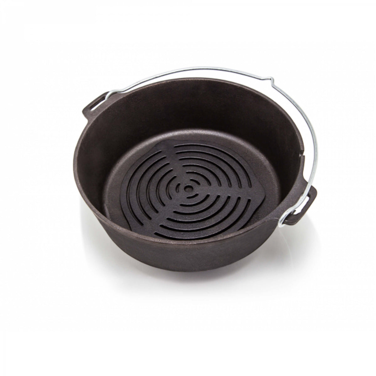 Der Einsatz aus massivem Gusseisen schafft eine erstklassige Hitzeverteilung – genau richtig zum Backen im Feuertopf. Weil der Einsatz auf drei Noppen steht, gelingen dir Dünsten, Garen und Backen mit dem Gussrost-Einsatz in den Feuertöpfen ft4.5, ft6, ft9 und ft12 ohne Anbrennen. Du kannst ihn aufgrund des sog. seasoned finish sofort einsetzen und musst ihn nicht einbrennen.