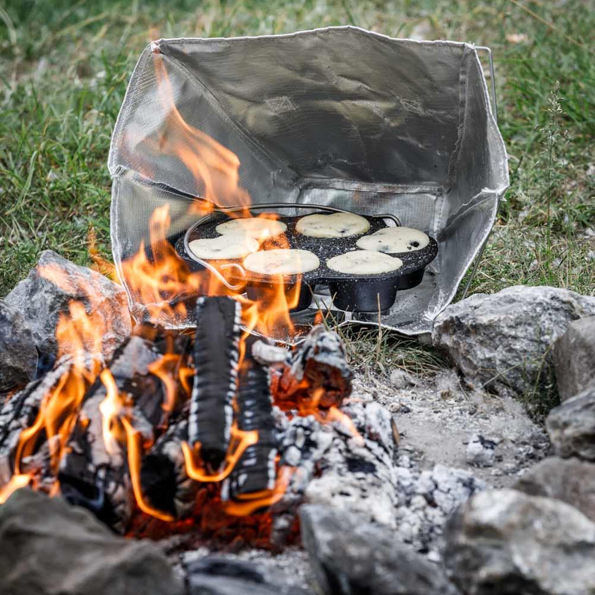 Im faltbaren Reflektorofen vo Petromax bereitest Du dank indirekter Hitze und intelligenter Reflexion der Wärme Brot, Kekse, Brötchen sowie Fisch, Fleisch und Geflügel zu. Zeitgleich kochst du über und im Feuer weitere Gerichte, z.B. im Dutch Oven.