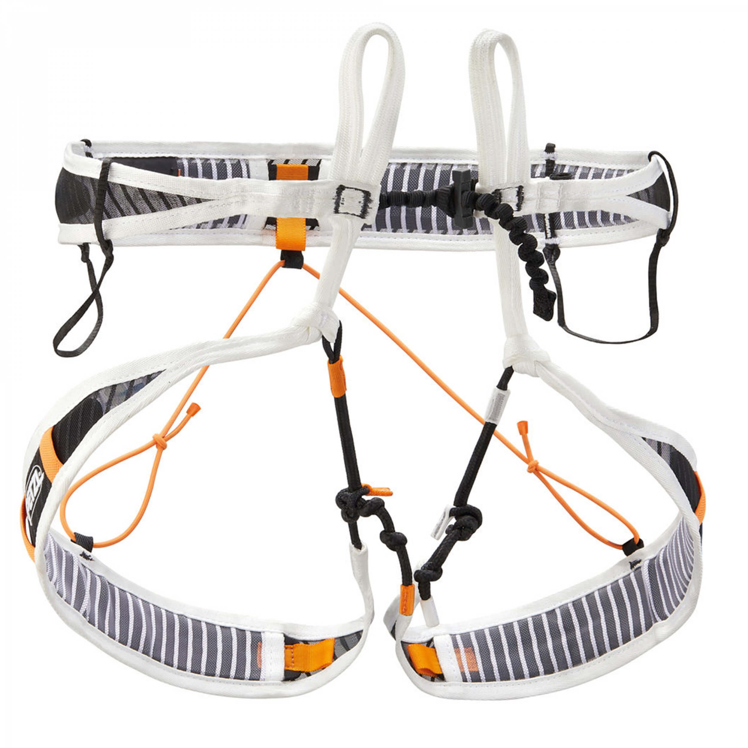 - innovatives Design ohne Schnalle (Petzl-Patent). Ein innovatives Einstellsystem ersetzt die Schnalle aus Metall und ermöglicht eine schnelle, einfache Anpassung des Hüftgurts. Die Beinschlaufen lassen sich mit einem Ankerstich anpassen,