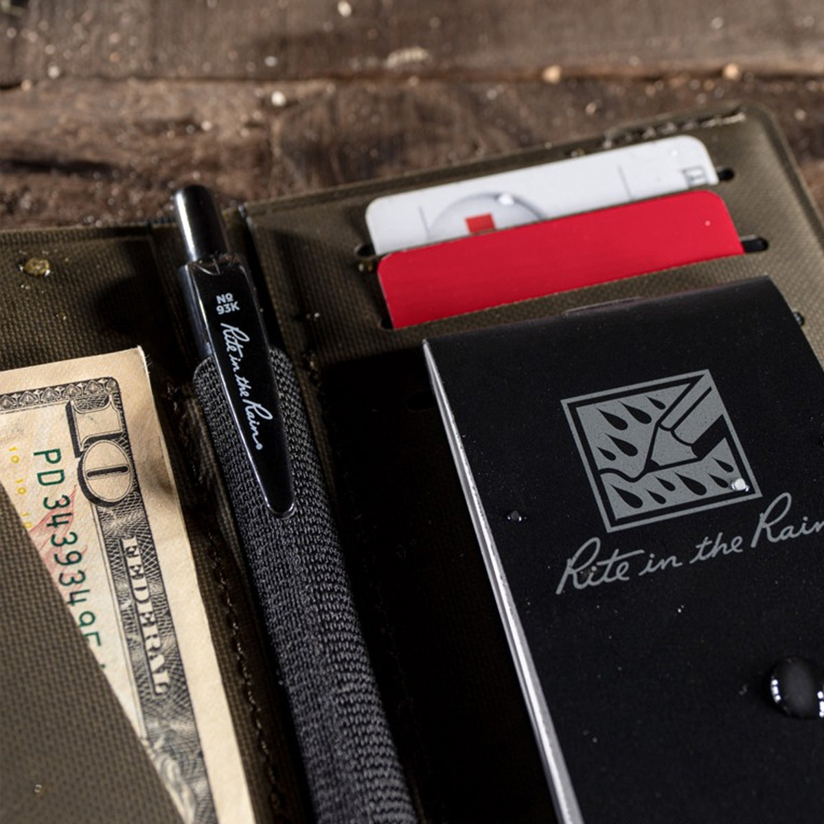 Das Rite in the Rain Monsoon Field Wallet aus robustem TPU-Material bietet ausreichend Stauraum für die wichtigsten Dinge des Alltags: Stift, Kreditkarten, Bargeld und Mini-Notebook oder Notizbuch für unterwegs.