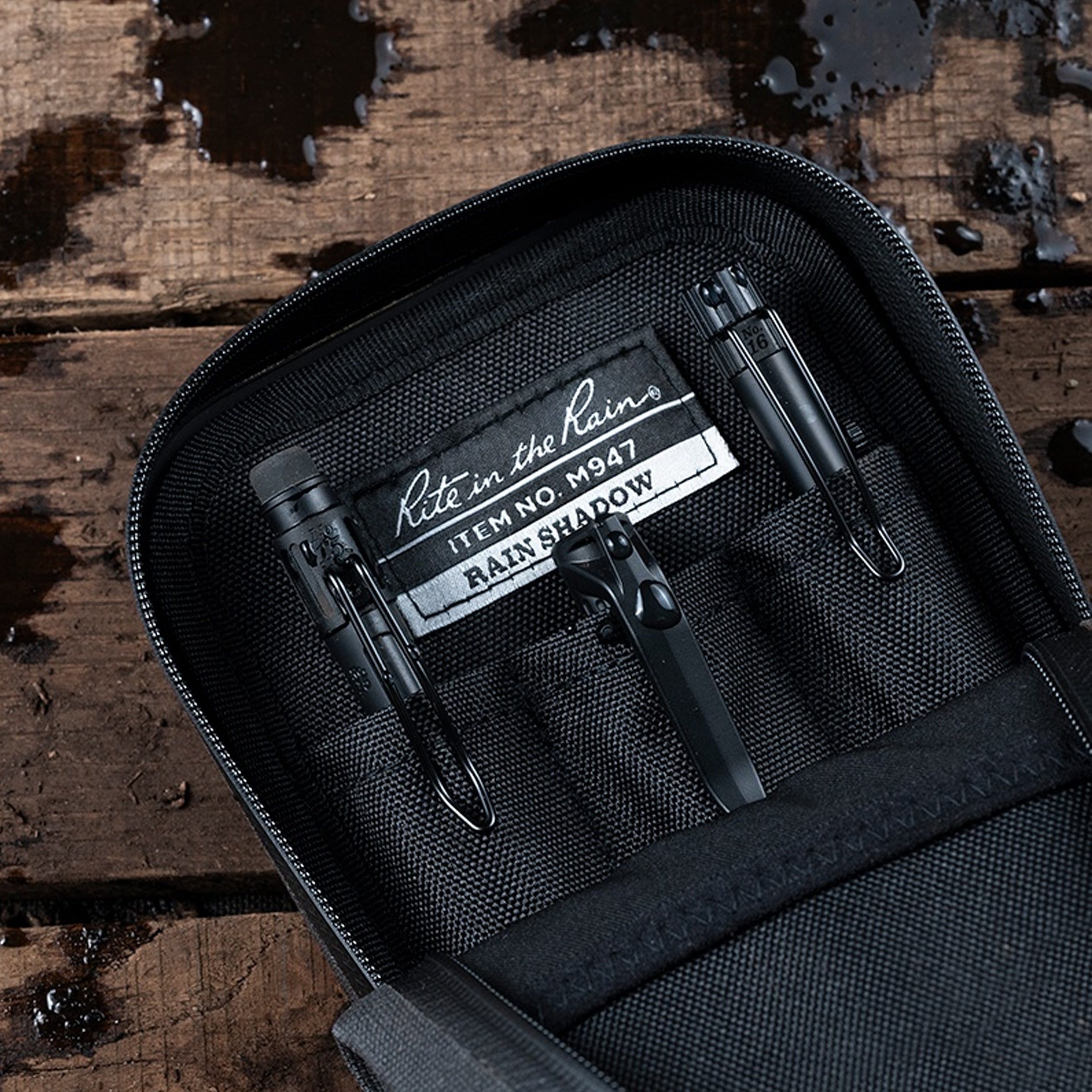 Innen sorgen ich drei interne Stifthalter, eine kleine Materialschlaufe und eine große Tasche für Ordnung in der gesamten Ausrüstung. Der Shadow Pouch ist passend für die Rite in the Rain 3 x 5 and 4 x 6 Notitzblöcke, Smarthphones, uvm.