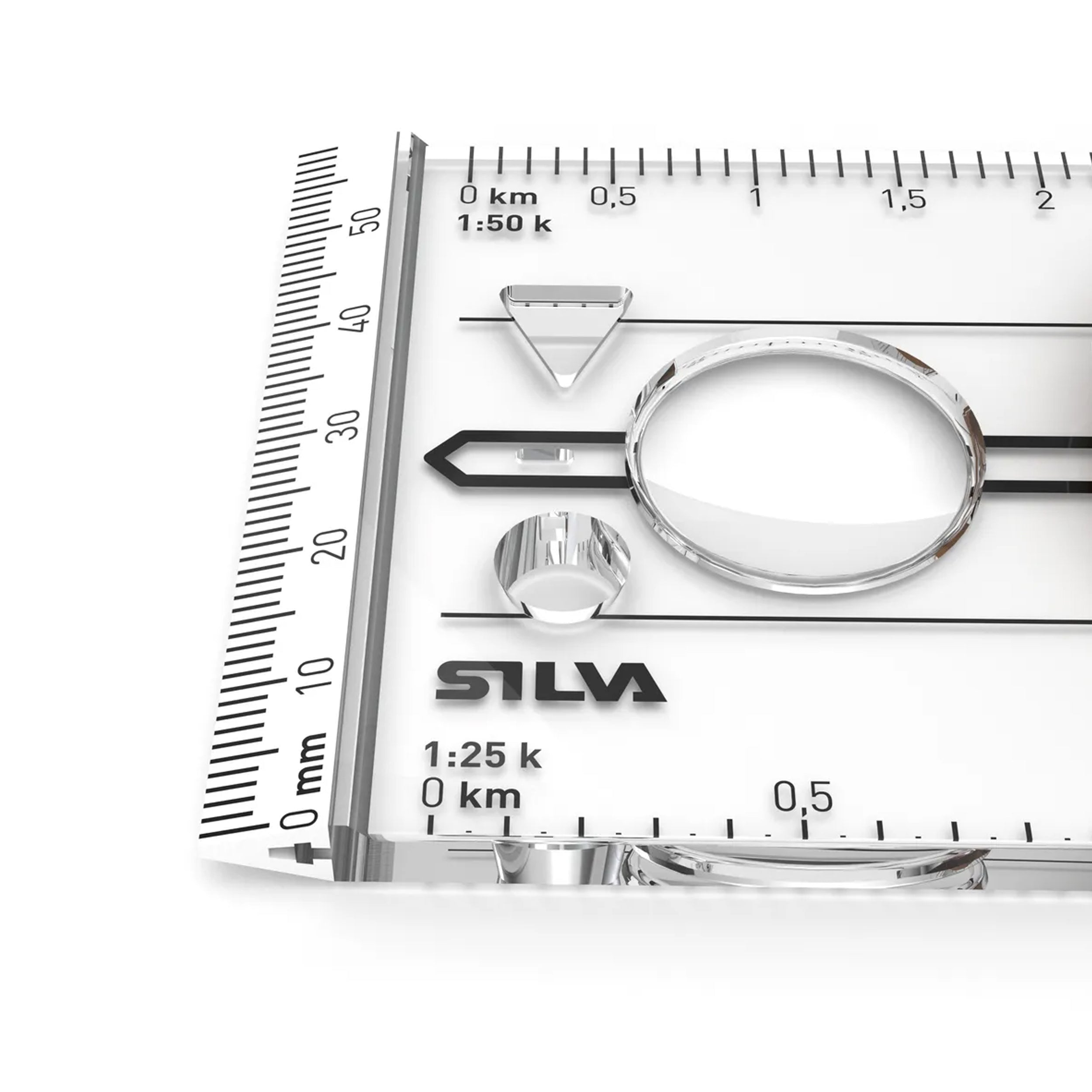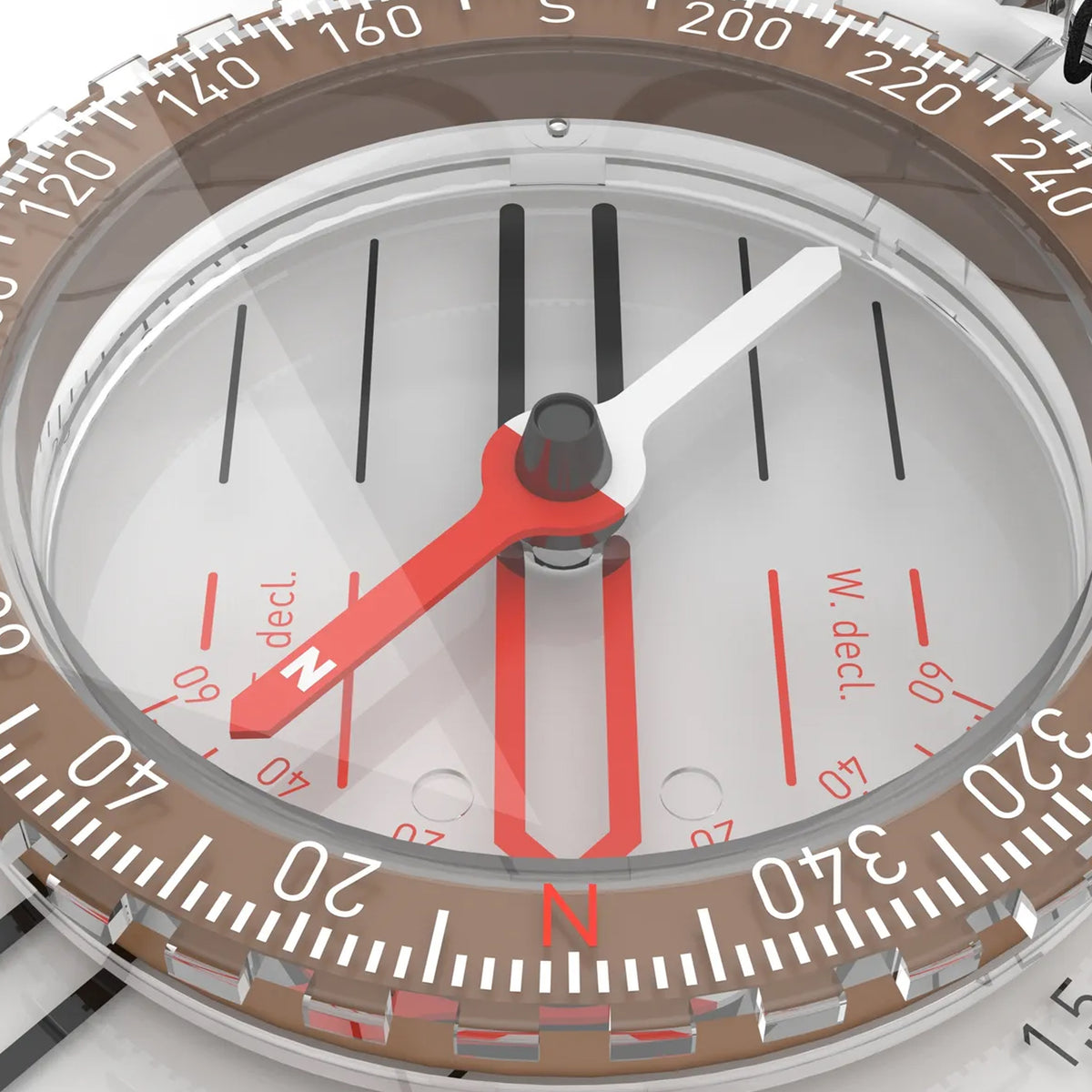 Die Grundplatte mit gebogenem hinterem Ende verfügt über eine Vergrößerungslinse für präzise Kartenarbeiten sowie Schablonenlöcher für Stern- und Kontrollmarkierungen auf der Vorderseite. Der Skalenschieber an der Spitze des Kompasses ist abnehmbar.
