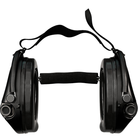 Die Version mit Nackenbügel besteht aus einem soliden Metall-Nackenbügel, der von einer weichen Textilhülle bedeckt ist, und einem dünnen Nylonband, das den Gehörschützer fest an seinem Platz hält und die Verwendung einer Mütze oder eines Helms darüber ermöglicht.