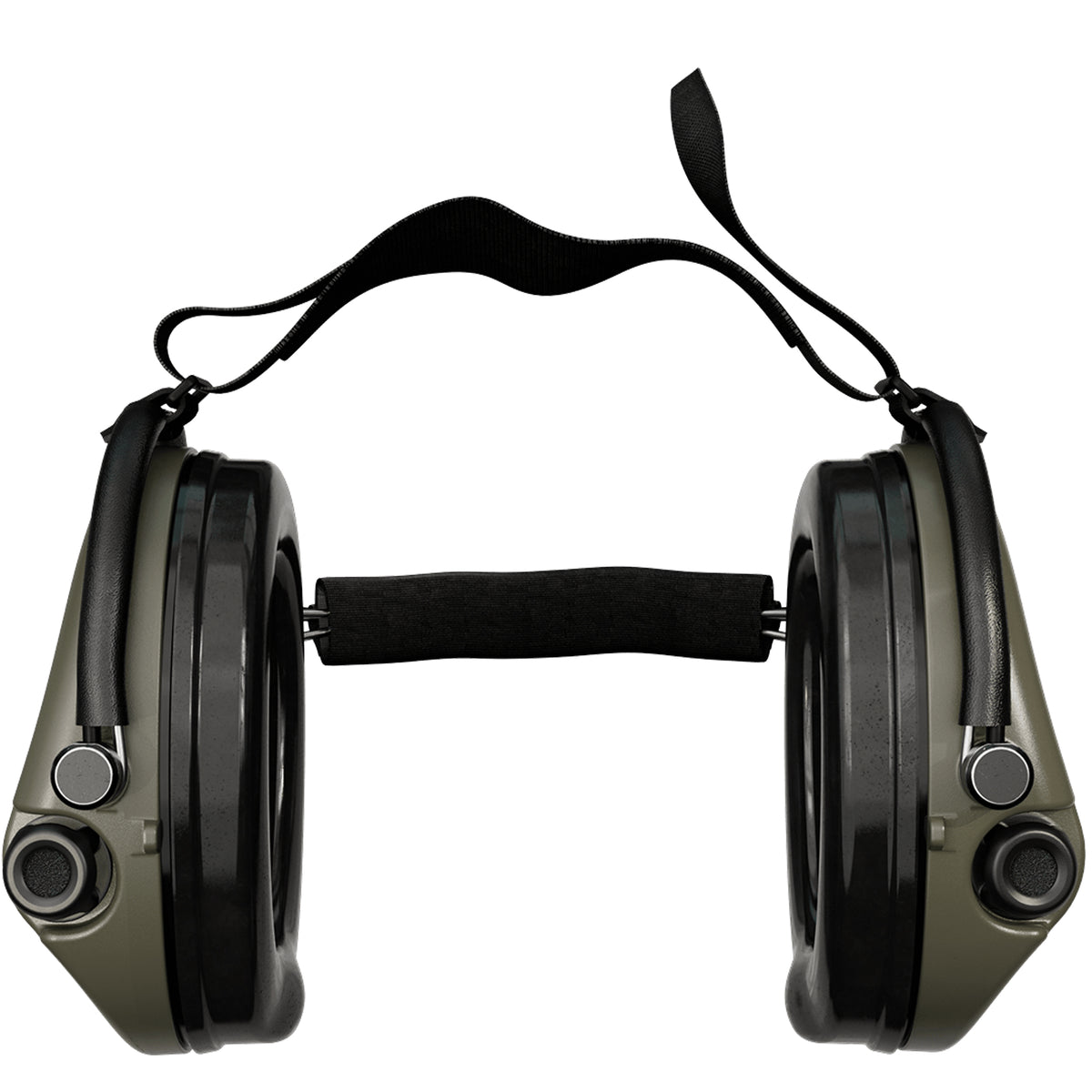 Die Version mit Nackenbügel besteht aus einem soliden Metall-Nackenbügel, der von einer weichen Textilhülle bedeckt ist, und einem dünnen Nylonband, das den Gehörschützer fest an seinem Platz hält und die Verwendung einer Mütze oder eines Helms darüber ermöglicht.
