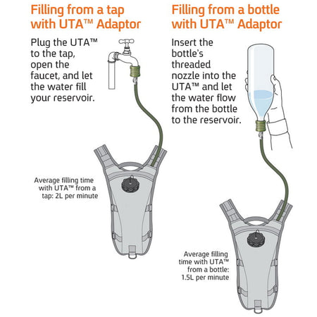 Der revolutionäre UTA Adapter von SOURCE erlaubt es Ihnen, die Trinkblase direkt durch den Trinkschlauch aufzufüllen. Sprich: Abnehmen oder Öffnen des Rucksacks ist nicht nötig. Ganz einfach Trinkventil abnehmen, UTA aufsetzen, an Flasche oder Wasserhahn andocken, auffüllen. Der Versiegelungs-Mechanismus des SQC Connectors bleibt dicht, auch wenn die Kupplung bei voller Trinkblase geöffnet wird.