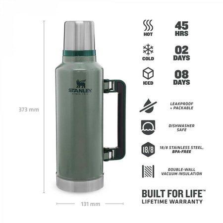 Die aus rostfreiem 18/8 Edelstahl gefertigte Stanley Classic Legendary Bottle ist mit einer schützenden, grünen Hammerschlaglackierung versehen. Die doppelwandige Vakuum-Isolation hält Getränke bis zu 24 Stunden heiß oder kalt. Der seitlich montierte Kunststofftragegriff sorgt für den problemlosen Transport der Flasche. Über dem Flaschenverschluss sitzt ein Trinkbecher, der ebenfalls isolierend ausgelegt ist. Durch die 5 cm weite Öffnung lässt sich die Flasche sehr gut reinigen. Fassungsvermögen 1,9 Liter.