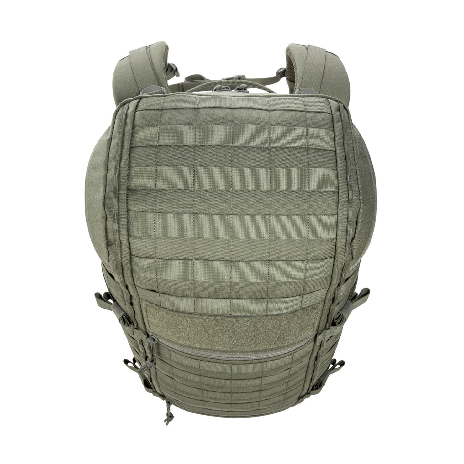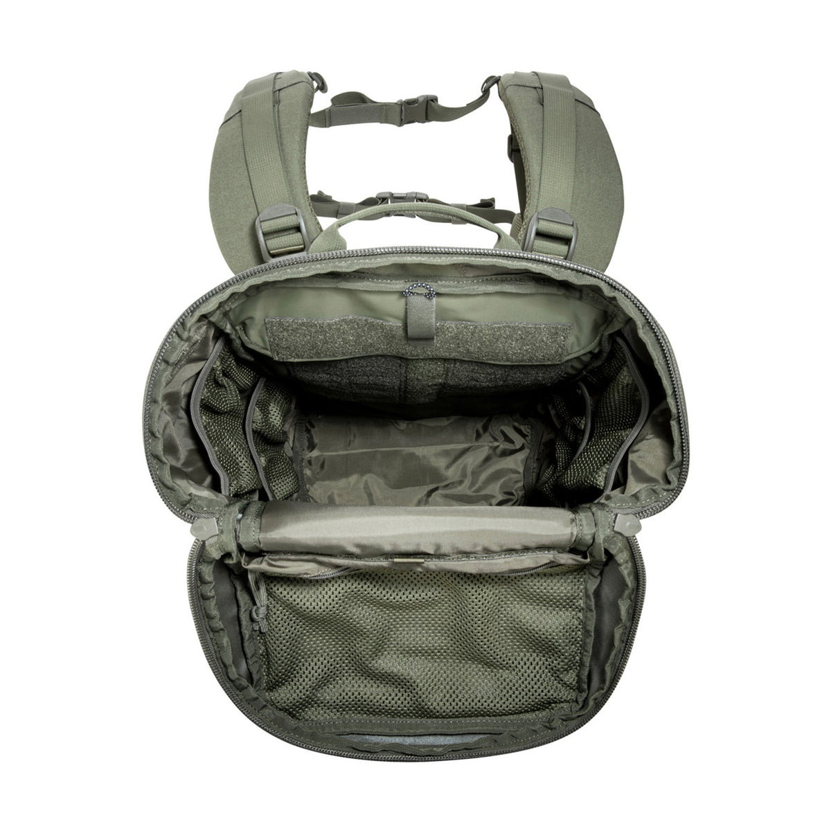 Der TT Base Pack Top Load 30 lässt sich durch den versteiften Deckel, welcher nach vorne aufklappt, einfach beladen. In der oberen Hälfte des Hauptfachs können Taschen eingeklettet oder eingeschlauft werden. Front, Seiten und Deckel des Rucksacks sind mit MOLLE zur individuellen Erweiterung ausgestattet.