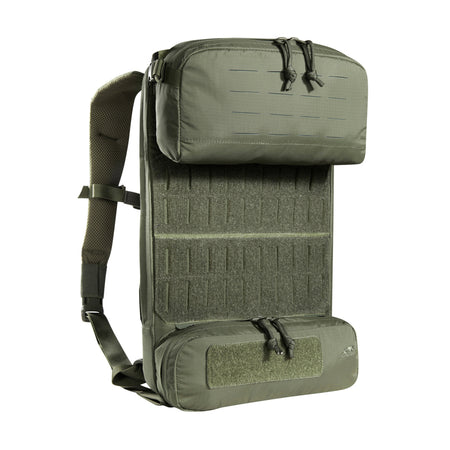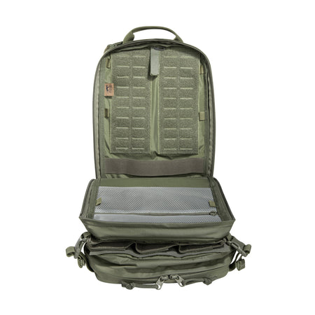 Die obere Fronttasche des Rucksacks lässt sich abklappen, dahinter kann ein Magazinhalter (drei M4-Magazine oder 4 Pistolen-/ MP7-Magazine; im Lieferumfang enthalten) angeklettet werden. Die beiden mittleren Fronttaschen lassen sich abnehmen, dahinter befindet sich eine MOLLE-Klettfläche. An der unteren Fronttasche können die TT Tac Pouch 12 oder die TT 2 SGL Backup Mag Pouch M4 befestigt werden. Der Rucksack ist auf der Rückseite mit einem MOLLE-Reverse System versehen, um ihn auf Plattenträgern einfädeln zu können. Auch eine Befestigung auf Plattenträgern per Adapter ist möglich.