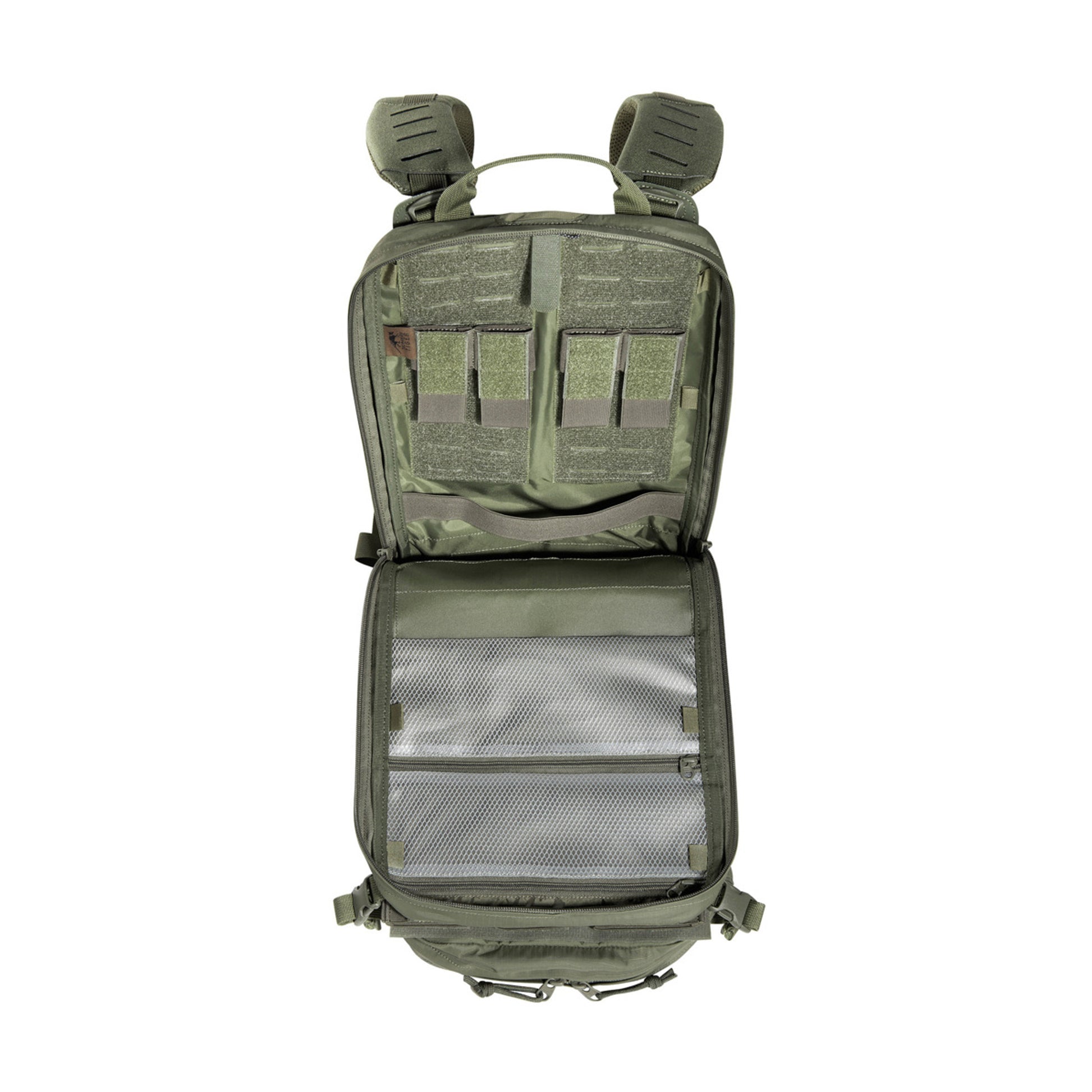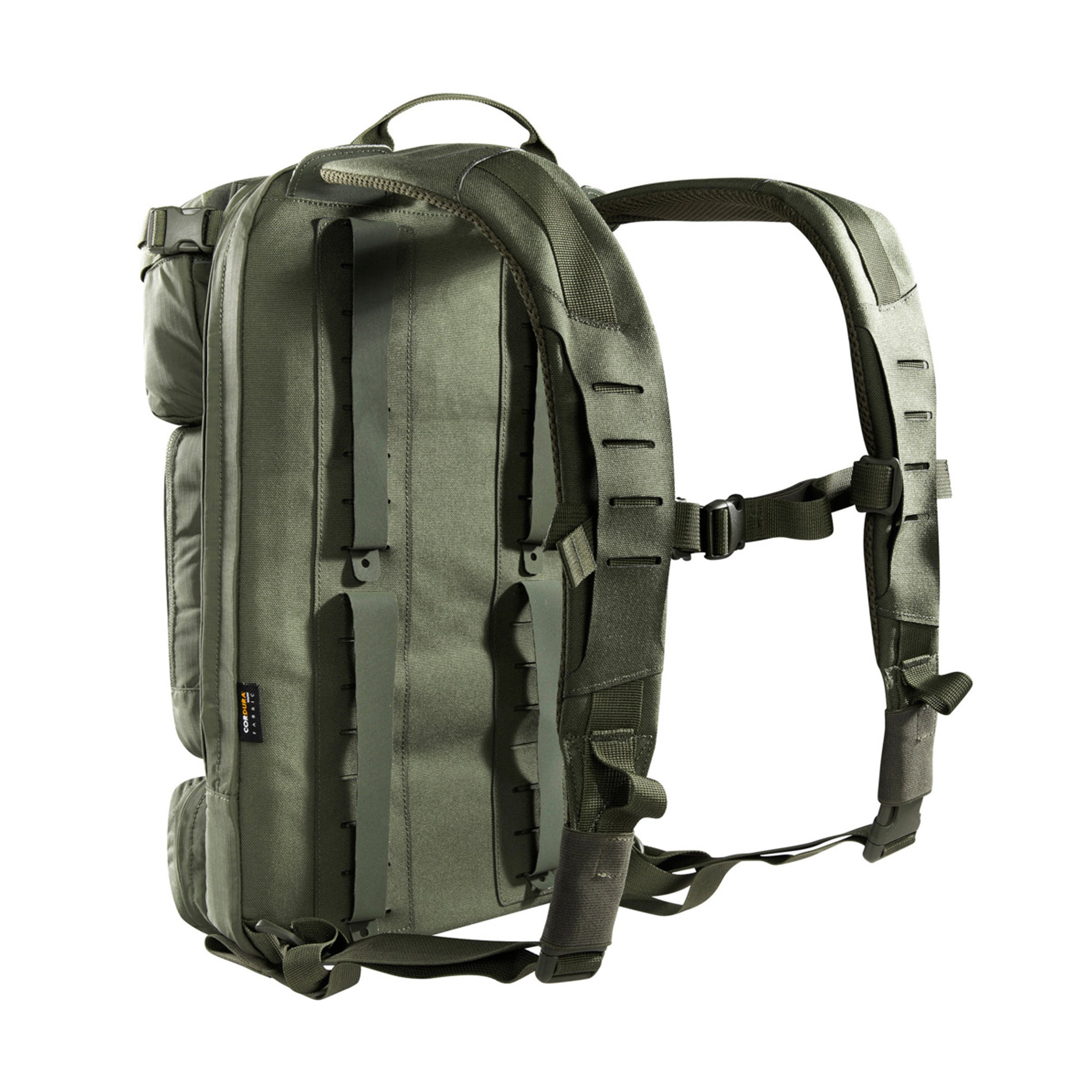 Die obere Fronttasche des Rucksacks lässt sich abklappen, dahinter kann ein Magazinhalter (drei M4-Magazine oder 4 Pistolen-/ MP7-Magazine; im Lieferumfang enthalten) angeklettet werden. Die beiden mittleren Fronttaschen lassen sich abnehmen, dahinter befindet sich eine MOLLE-Klettfläche. An der unteren Fronttasche können die TT Tac Pouch 12 oder die TT 2 SGL Backup Mag Pouch M4 befestigt werden. Der Rucksack ist auf der Rückseite mit einem MOLLE-Reverse System versehen, um ihn auf Plattenträgern einfädeln zu können. Auch eine Befestigung auf Plattenträgern per Adapter ist möglich.