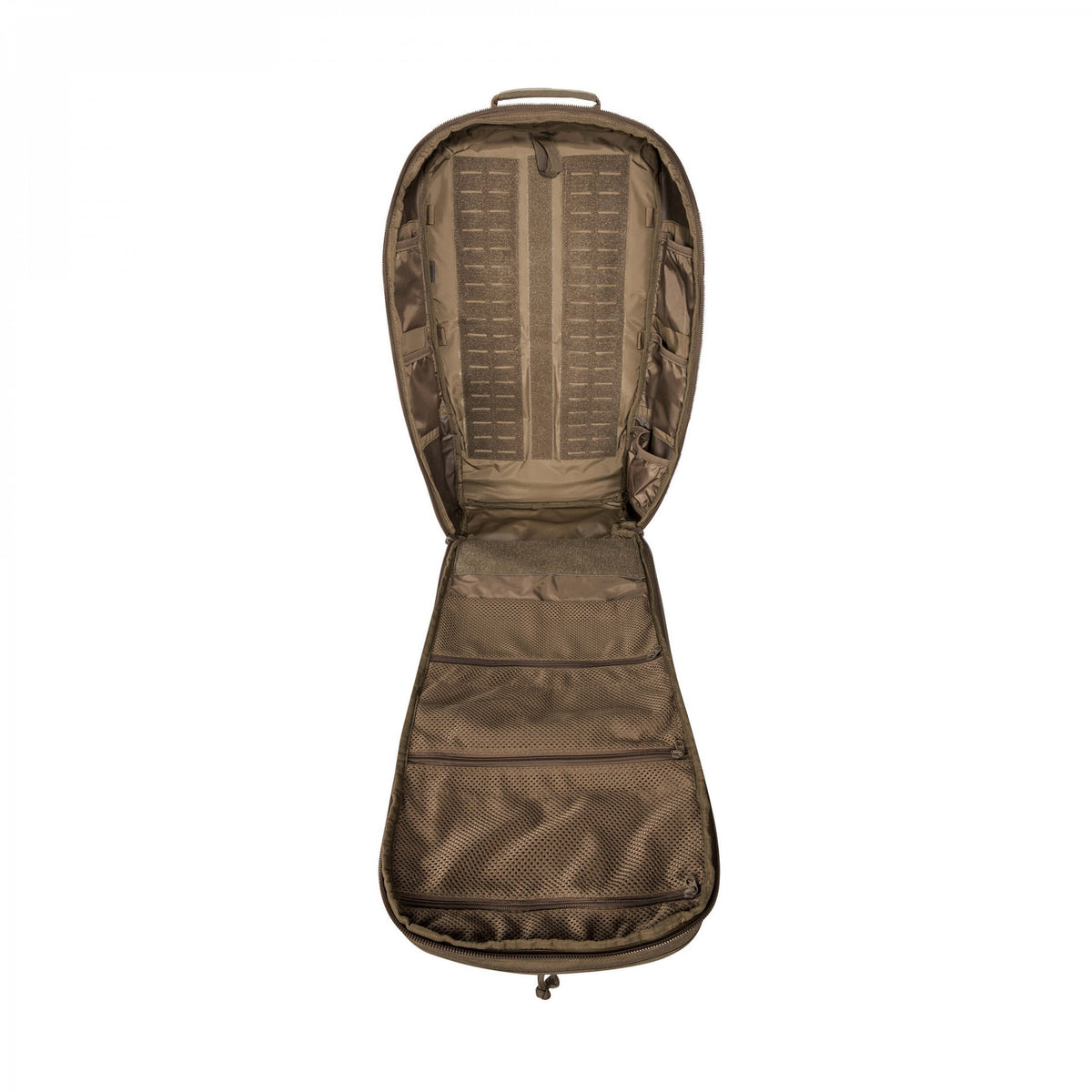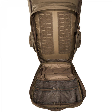 Die Rückwände von Haupt- und Frontfächern sind mit MOLLE-Klett für die individuelle, modulare Bestückung belegt, beide Frontfächer verfügen über Reißverschluss-Netztaschen zur Organisation. Lasercut-MOLLE auf der Front und an den Seiten des Rucksacks ermöglicht die Anbringung zusätzlicher Taschen oder Ausrüstung. Der Rucksack besitzt eine integrierte Regenhülle und einen abnehmbaren Hüftgurt, der sich auch als Warrior Belt nutzen lässt. Das Rückensystem ist auf verschiedene Rückenlängen einstellbar.