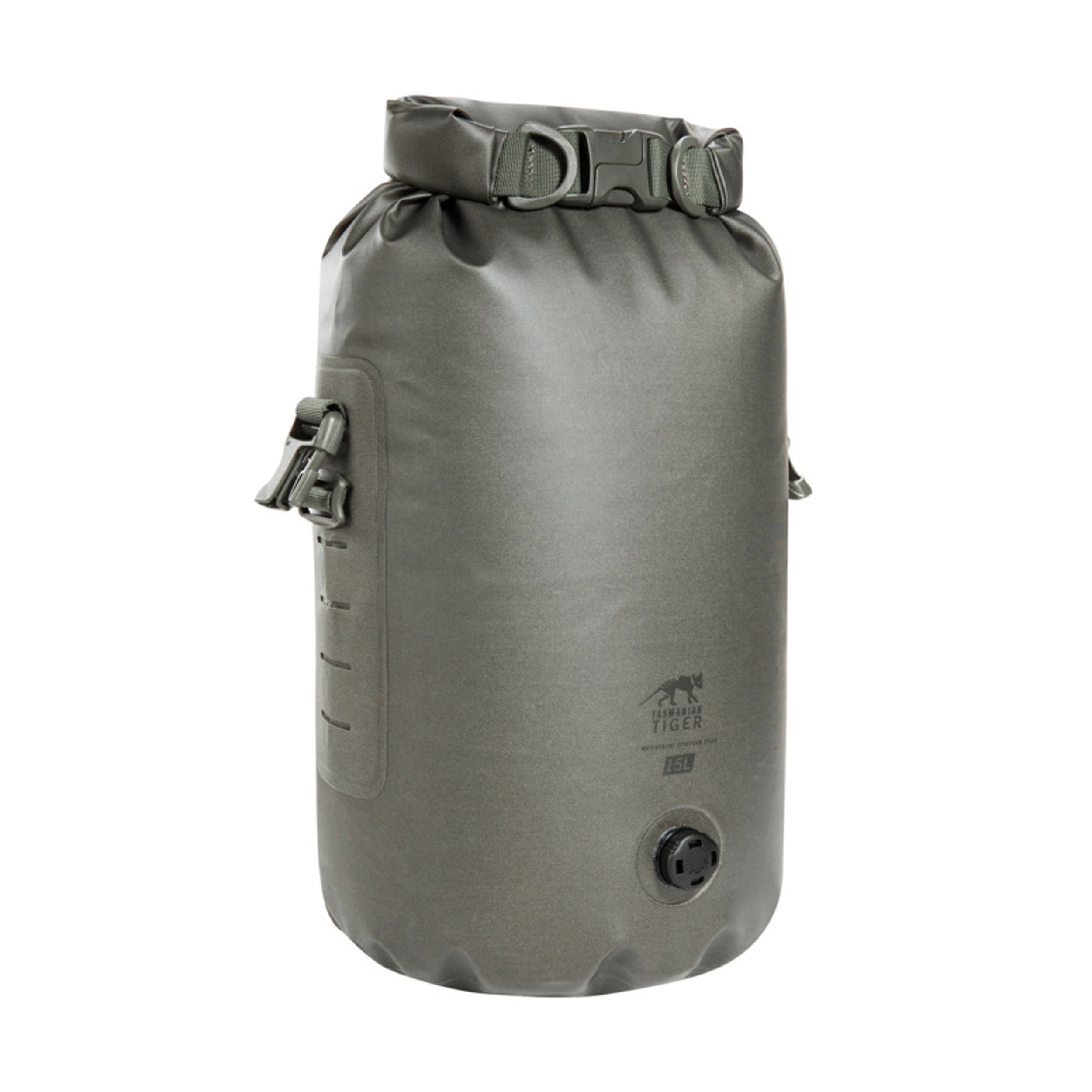 Der Tasmanian Tiger TT Stuffbag 15 WPV ist ein robuster, wasserdichter Packsack mit Rollverschluss und Ventil zum Komprimieren.