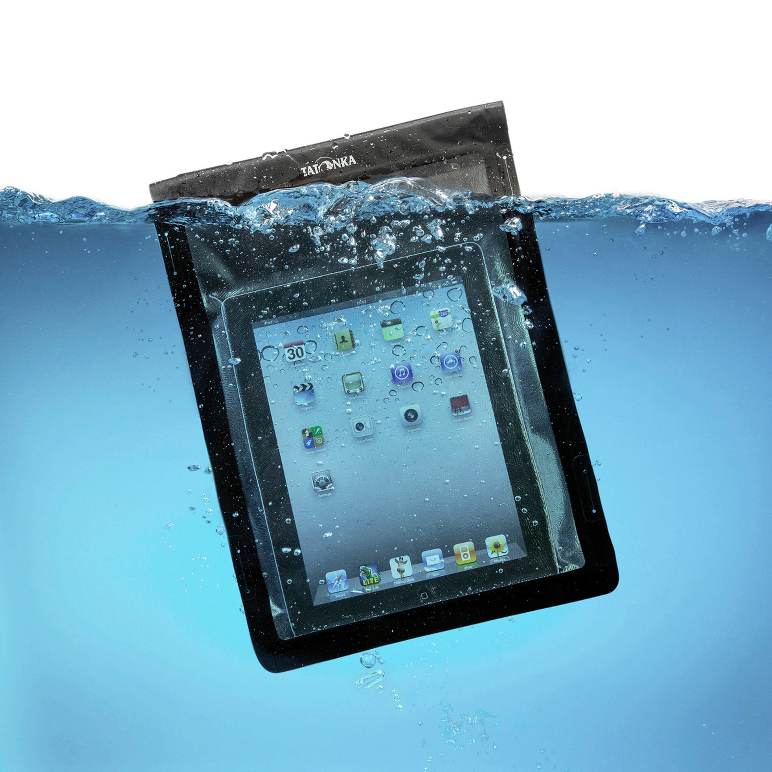 Die wasserdichte Outdoor-Schutzhülle WP Dry Bag A4 von Tatonka schützt dein Tablet vor Regen, Schnee und Schmutz.