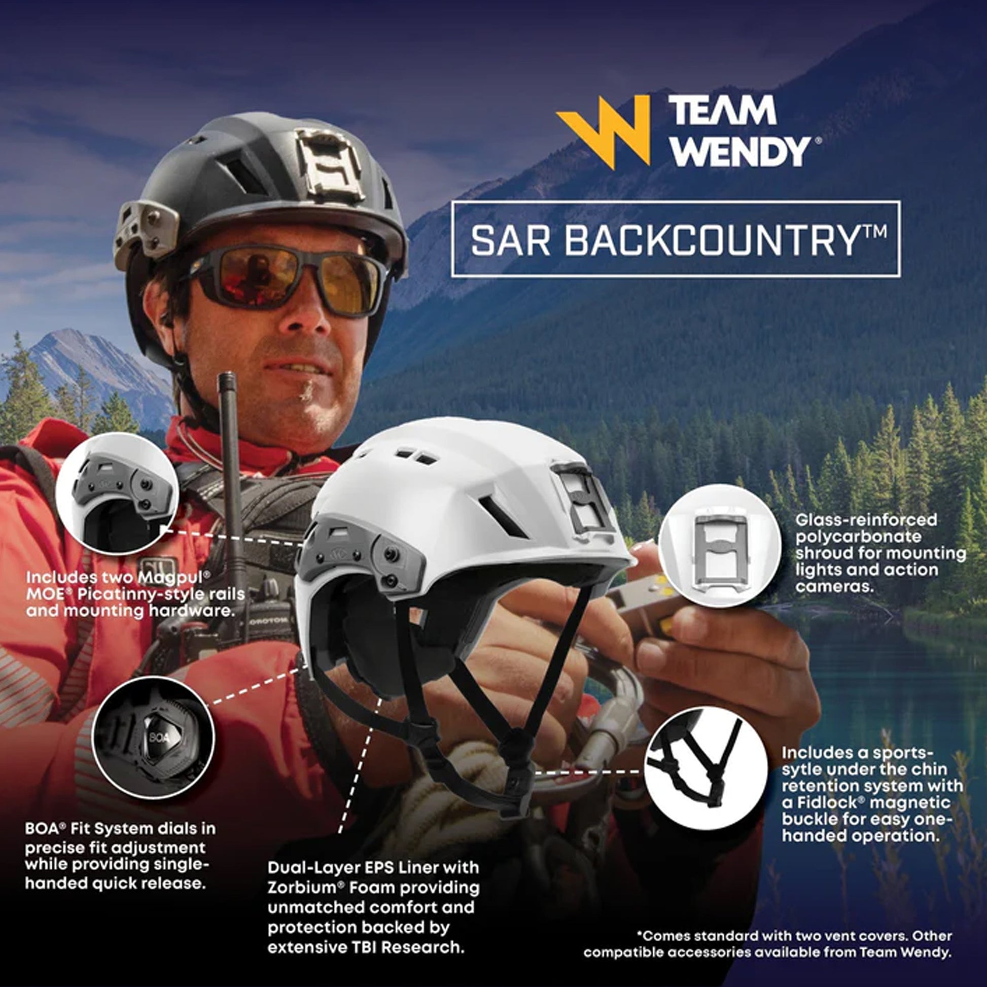 Der Team Wendy® EXFIL® SAR Backcountry™ ist der erste speziell für Such- und Rettungseinsätze konzipierte Helm, der die Möglichkeit bietet, Zubehör zu montieren und gleichzeitig die wichtigsten Leistungsstandards für Industrie und Bergsteigen zu erfüllen.