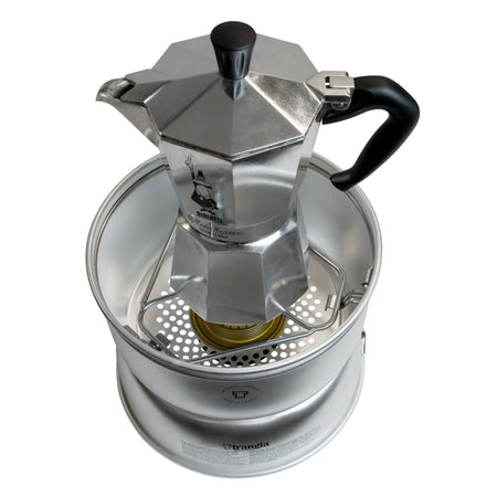 Der Pan Stand Kochereinsatz ist eine clevere Lösung, wenn Du Lebensmittel in kleineren Gefäßen auf Deinem Kocher erwärmen möchtest, wie z.B. eine Ravioli-Dose, ein Würstchenglas - oder natürlich auch wenn Sie die heißgeliebte Espressomaschine auf dem Trangia-Kocher nutzen wollen.