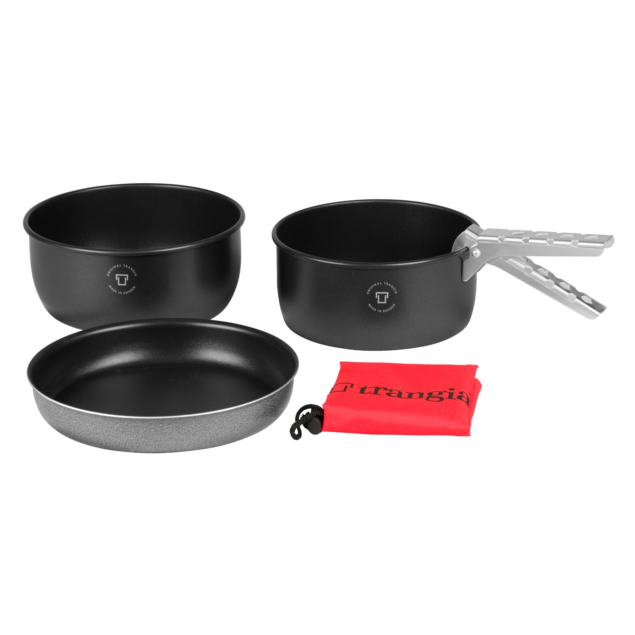 Das Trangia Tundra Set I Non-Stick ist die Ergänzung zu den Trangia Campingkochern, dass ohne Brenner verkauft wird und auch für Gasherde geeignet ist. Die Töpfe und Pfannen haben gefräste Böden, damit sie auf dem Gasherd nicht verrutschen. Dieses Set ist ideal für Boote, Wohnwagen oder Ferienhütten. Die Töpfe sind die gleichen wie in der Serie 25 Large, aber die Bratpfanne ist eine andere Version und passt nicht auf Trangia Sturmkochersets. Die Bratpfanne hat einen 1,4 mm starken Boden, der sie sehr stabil macht.