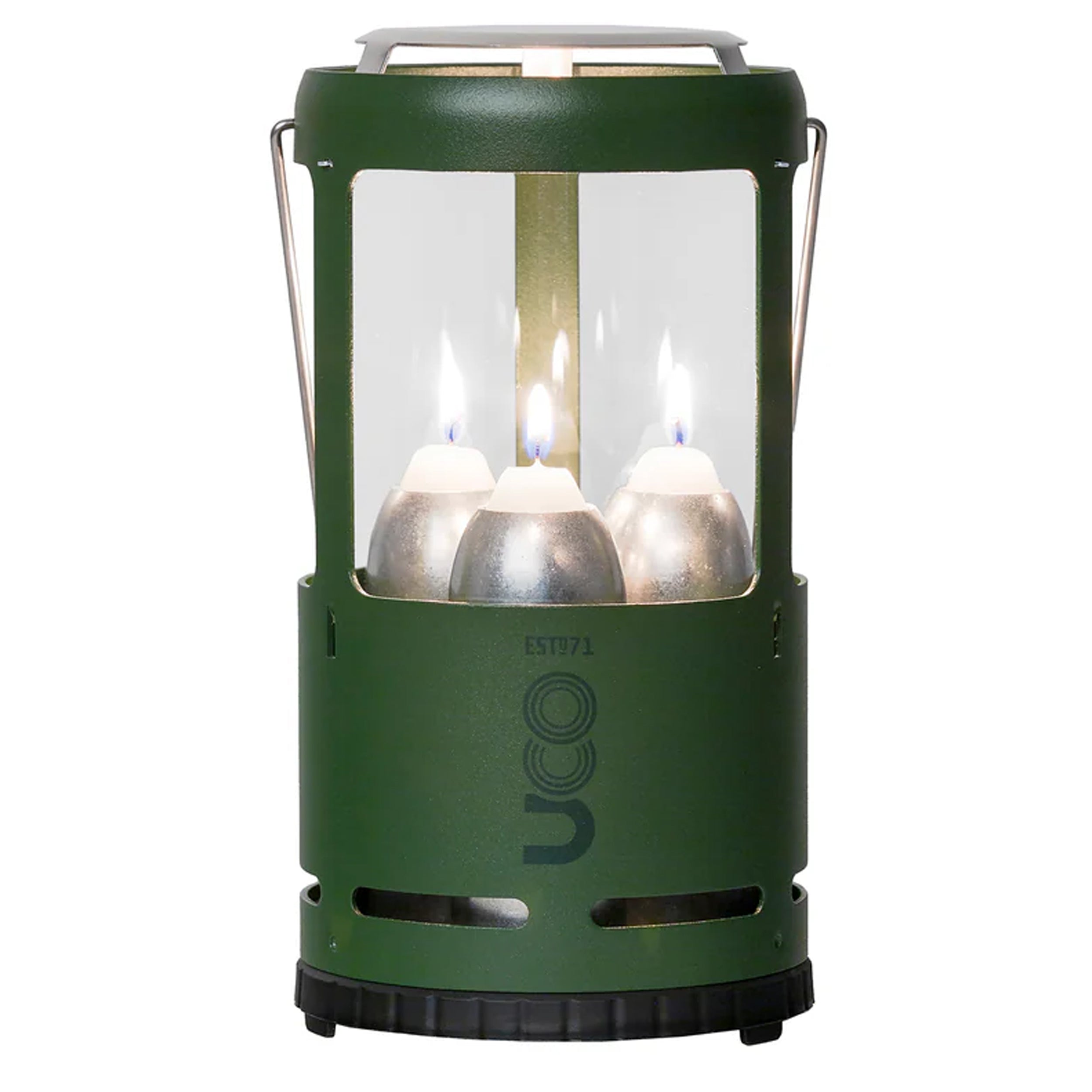 Die UCO Candlelier Kerzenlaterne mit ihren drei 9-Stunden-Kerzen ist die brillante Wärme- und Lichtquelle und perfekt für große Gruppen von Campern sowie für den Einsatz zu Hause und im Notfall. Mit dieser windfesten Laterne können Sie Ihr nächstes Familienpicknick erhellen und auch Ihren Kaffee warmhalten.