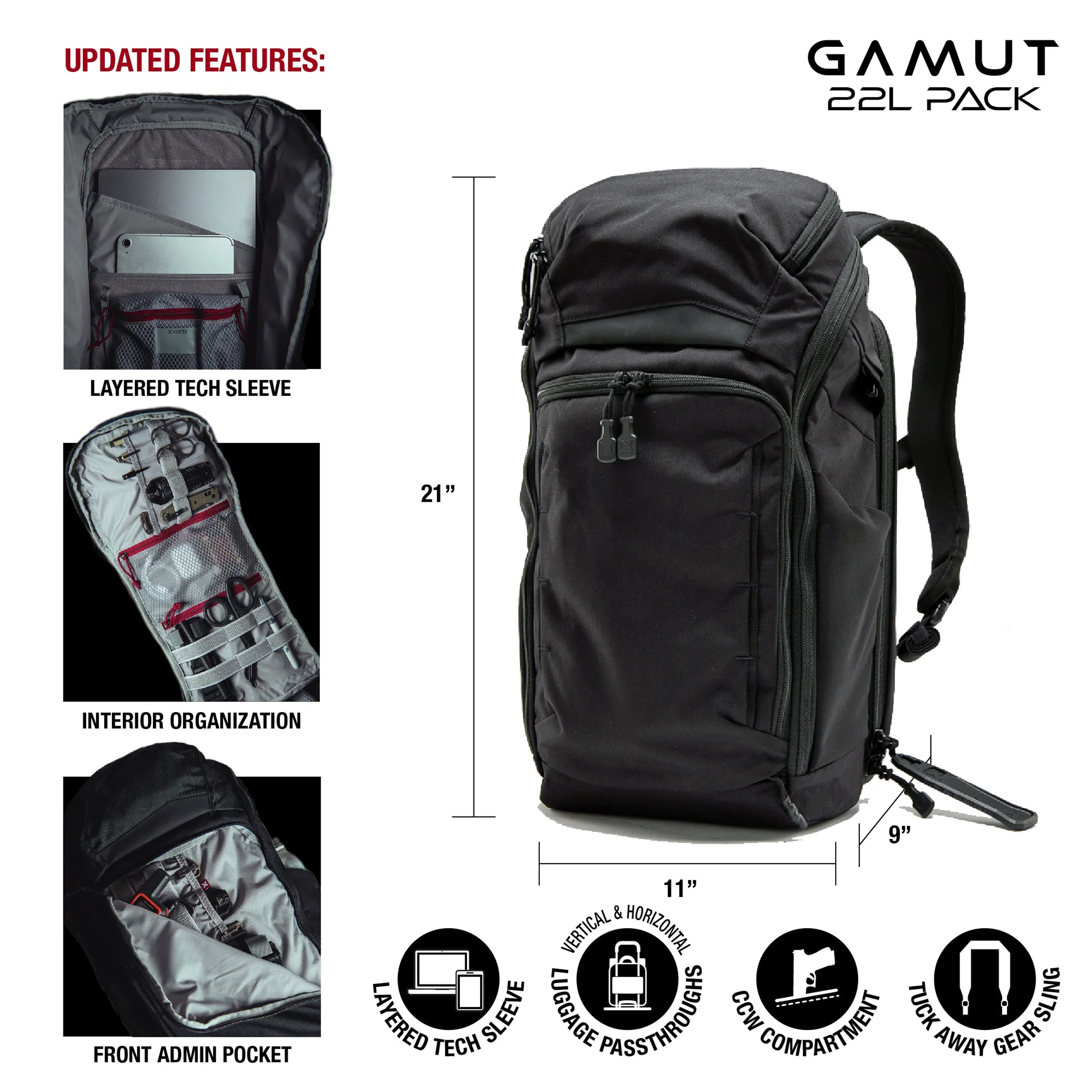 Die neue Gamut-Serie zeichnet sich außerdem durch eine bessere modulare Organisation, mehr funktionale Verbesserungen und erhöhten Komfort aus. Jede Tasche der Serie bietet einen schnelleren Zugriff auf CCW und wichtige Utensilien, eine verbesserte Innenorganisation und die Kompatibilität mit diskreten ballistischen Einsätzen. Jeder Rucksack ist an verschiedene Umgebungen, Einsätze und Trageweisen anpassbar, was die Gamut-Serie zum idealen System für moderne Vorbereitung macht.