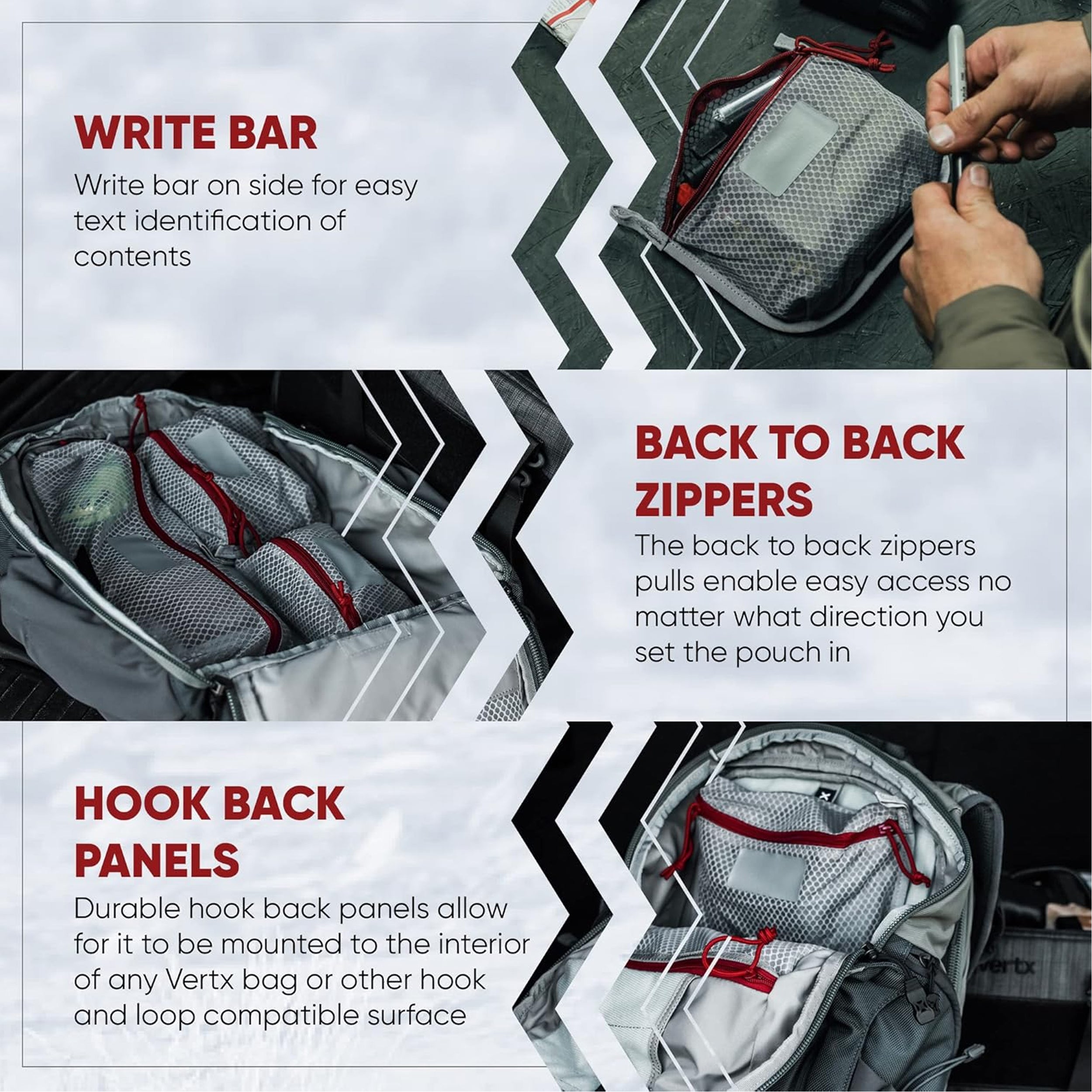 Die Vertx Overflow Mesh Pouches sind semitransparente Aufbewahrungstaschen mit Reißverschlus, welche an der Innenseite einer Vertx-Tasche oder einer anderen klettbaren Oberfläche befestigt zu werden können. Die Rücken-an-Rücken-Reißverschlüsse ermöglichen einen einfachen Zugriff, unabhängig davon, in welche Richtung Sie die Tasche einsetzen.